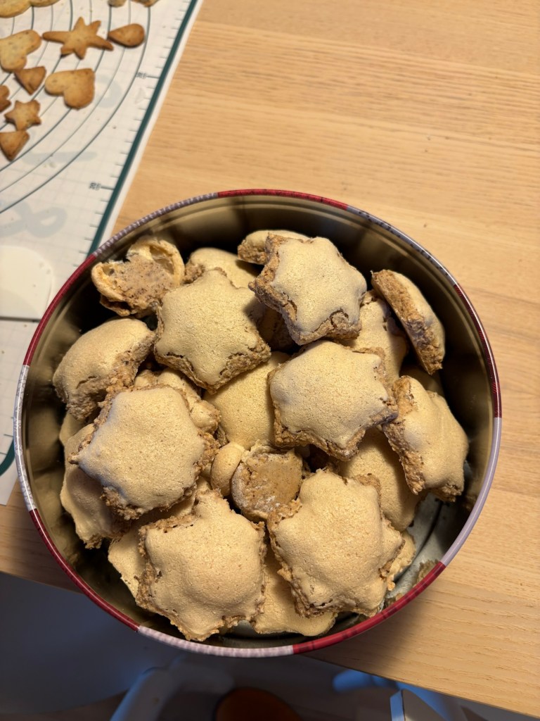 Heute war trotzdem Heiligabend und jetzt haben wir eben nicht nur normal zu viel zu essen sondern noch für eine Person mehr zu viel zu essen. Pippi hat vormittags Kekse dekoriert und ich habe sehr viel Zeit in der Küche verbracht. Ich habe Pippi dabei auch sehr gerne zugeguckt, Weihnachtskekse backen ist eine sehr schöne Kindheitserinnerung. Ich habe sogar zum zweiten Mal in meinem Leben Zimtsterne gebacken. Ich weiß jetzt auch wieder, warum ich das nie mache, das ist eine solche Klebepampe, die man kaum Teig nennen kann und hinterher ist überall sowohl diese Pampe als auch Puderzucker. Aber grob sternförmig sind sie geworden, und sehr lecker.
