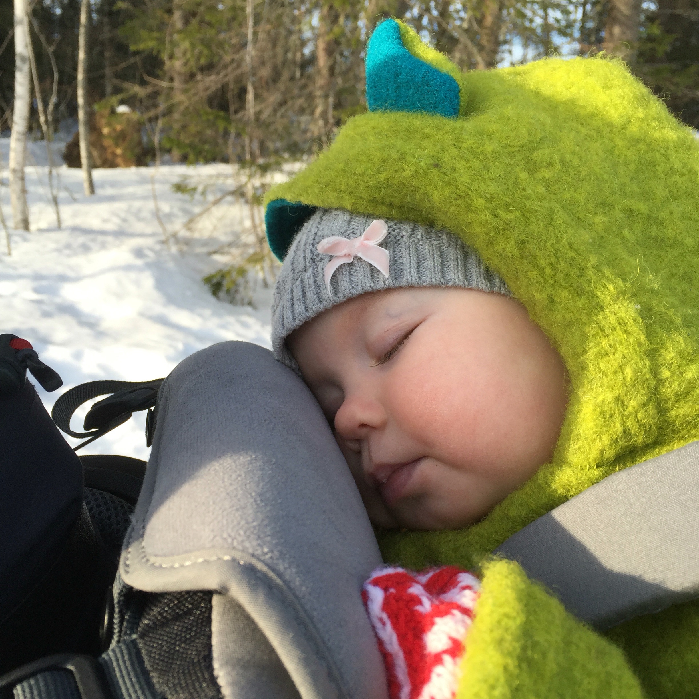Und dann in die Trage. Sie konnte sich zwar kaum bewegen, fand das aber nicht weiter schlimm und guckte den Hinweg über in der Gegend herum. Michel, der tapfere Schneezwerg, lief mit nur wenig Genörgel den Berg hoch. Das dauerte natürlich ein bisschen, auch wenn es nur etwas mehr als ein Kilometer war, mit so kurzen Beinen und stetig bergauf ist das schon auch anstrengend. Wir motivierten ihn mit Eis, das es auf der Hütte sicherlich gäbe.