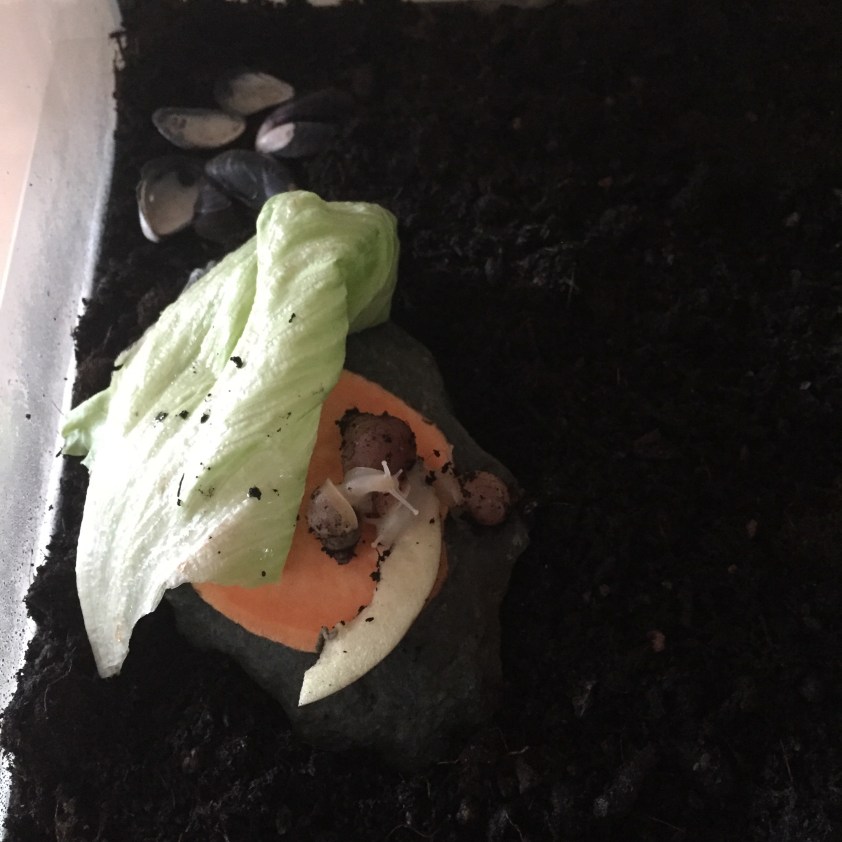 Ich hab dann das zweite Stück Sepiaschale auch noch reingelegt, nicht, dass den Schnecken das zu weit ist den ganzen Weg durch das Terrarium! (Ach, ich freu mich drauf, dass die größer werden!)