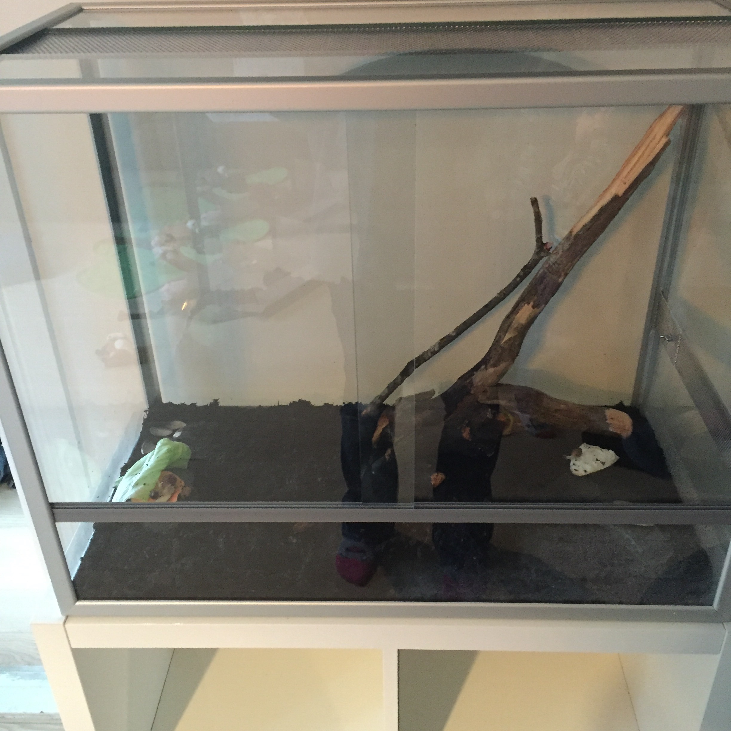 07.07. spät: wir packen das Monstrum aus. Es ist in 10 cm dicke Styroporplatten verpackt. Michel haut mit seinem Hammer auf den Platten herum und verteilt Styroporkügelchen und -Fitzelchen in der ganzen Wohnung. Pippi isst ein paar davon. Ich trage sie weg und mache sie bettfertig, Herr Rabe packt weiter aus. Ich höre ihn fluchen und dann den Staubsauger holen. Das Terrarium an sich ist wie erwartet, allerdings ist die eine Tür kaputt. Und hat überall rumgesplittert. Wunderbar.
