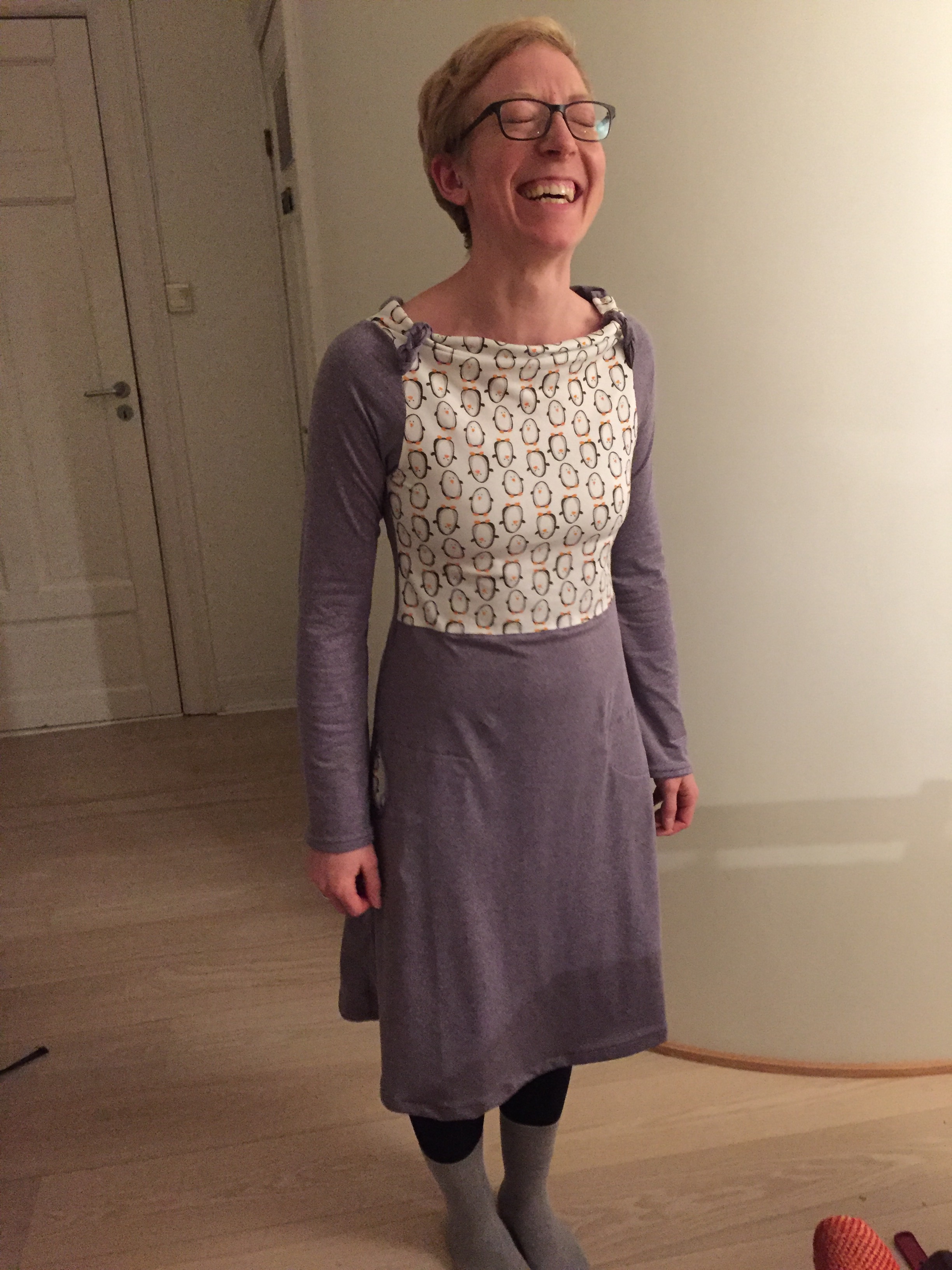 An das Klamotten selber nähen könnte ich mich gewöhnen. Das macht Spaß, entspannt (wenn man nicht grad fünf Zentimeter vor Ende der letzten Naht neuen Unterfaden aufspulen muss) und man hat am Ende Dinge, die einem wirklich gut gefallen. Zum Beispiel weil sie voller Pinguine sind. Und Taschen haben.