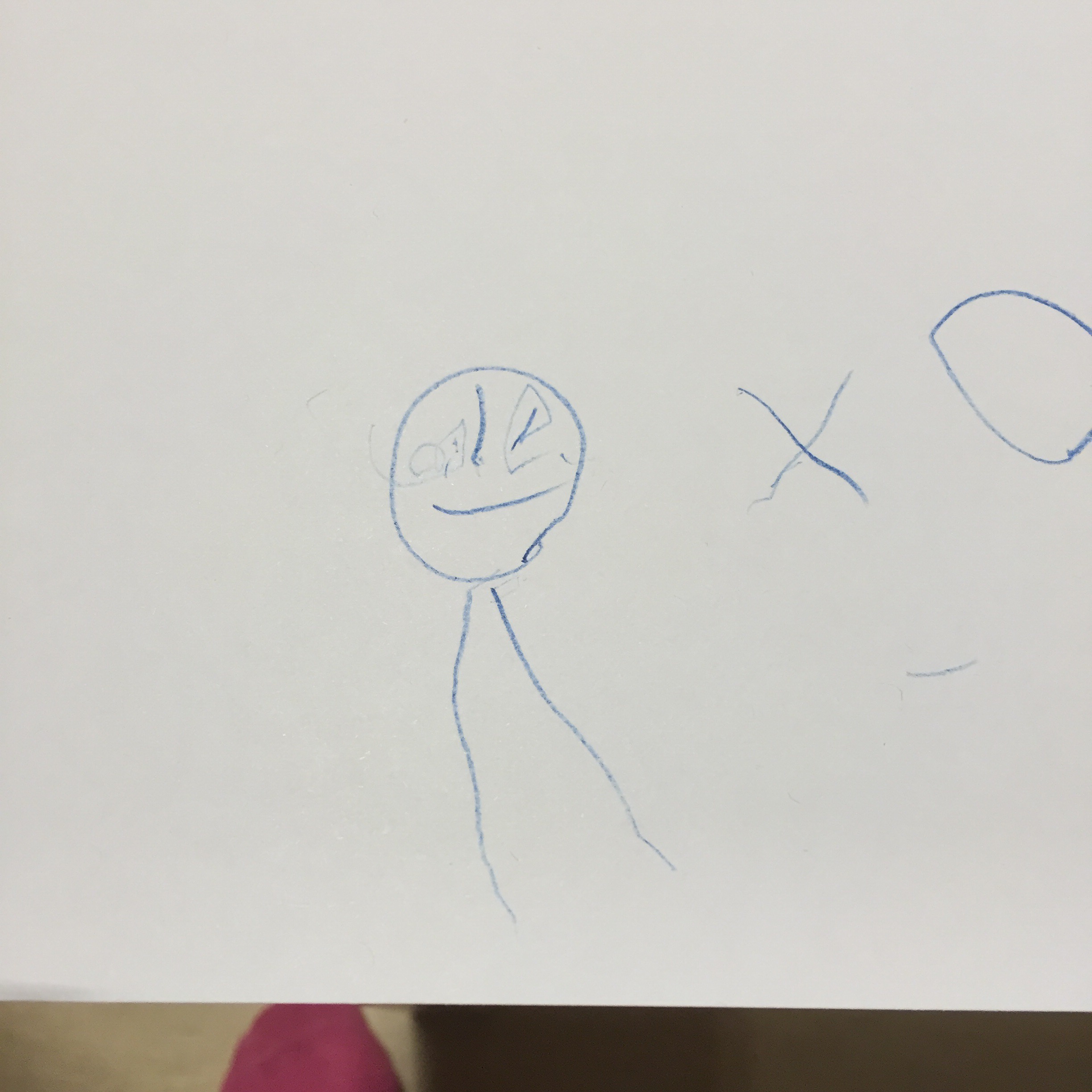 Hier noch das Bild, dass Michel von mir bei der Helsestasjon malte. Das kam so: er sollte eigentlich einen Kreis malen, die Frau malte ihn vor und er sagte: „Das ist ja so rund! Wie ein Ball! Oder die Sonne! Ein Kopf ist auch rund! Und Gläser…“ die Frau fragte ihn dann, ob er auch sowas malen könnte, er meinte aber, er hätte keine Lust. Ob er denn dann vielleicht Lust hätte, Mama zu malen? Ja klar. (Den Kreis so und auch ein Kreuz malte er dann später noch. Fürs Protokoll.)