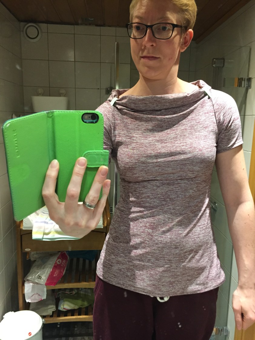 Kleiner Tipp: Oberarmumfang > Handgelenkumfang, die 23 cm Armbündchen reichen bei der Kurzarmversion so eben, wenn der Stoff sehr stretchy ist (so wie dieser). Sonst gefällt mir der Schnitt sehr gut, obwohl ich meistens nicht so auf gerafftes stehe (vor allem an den Schultern).