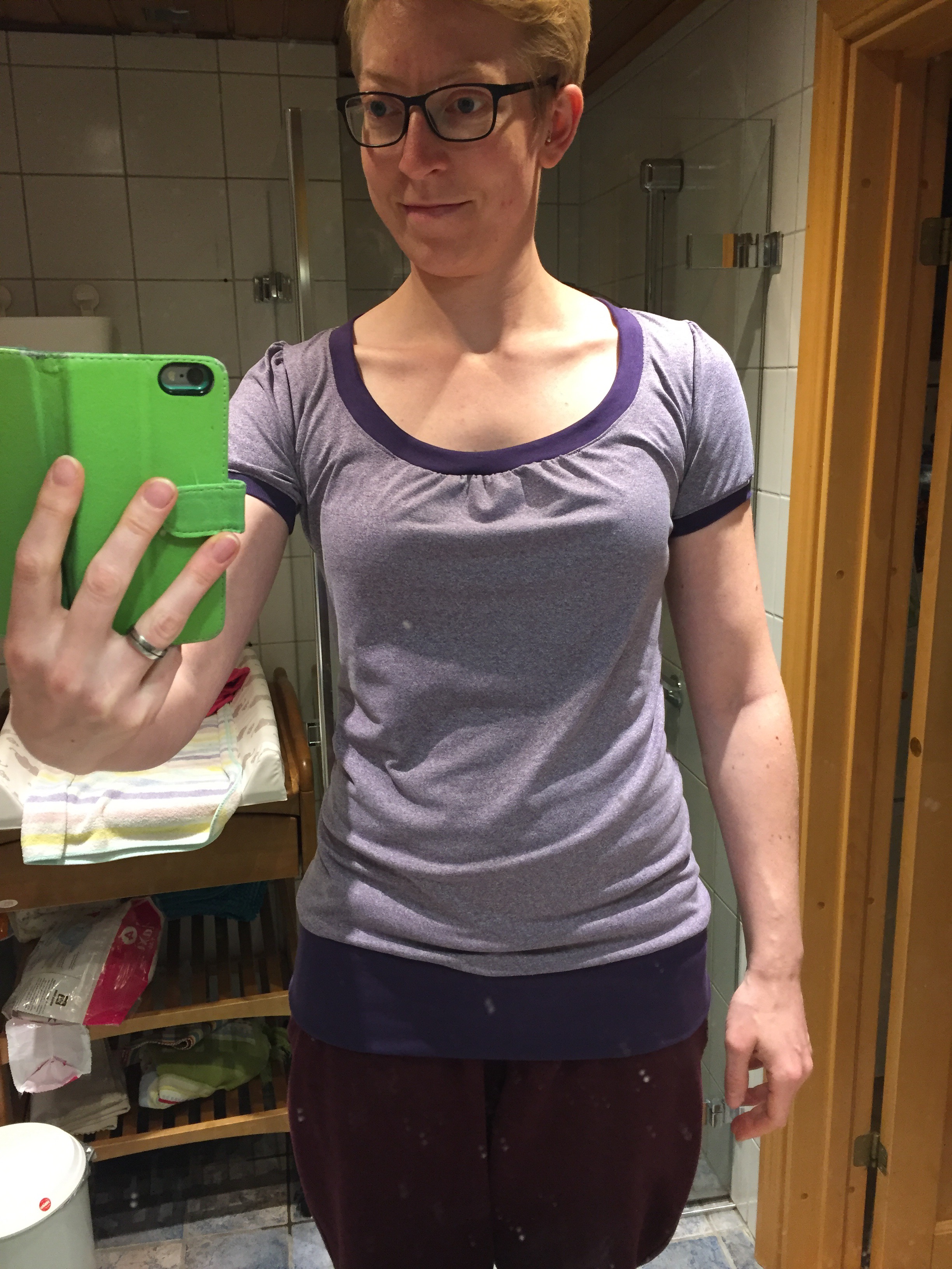 Kleiner Tipp: Oberarmumfang > Handgelenkumfang, die 23 cm Armbündchen reichen bei der Kurzarmversion so eben, wenn der Stoff sehr stretchy ist (so wie dieser). Sonst gefällt mir der Schnitt sehr gut, obwohl ich meistens nicht so auf gerafftes stehe (vor allem an den Schultern).