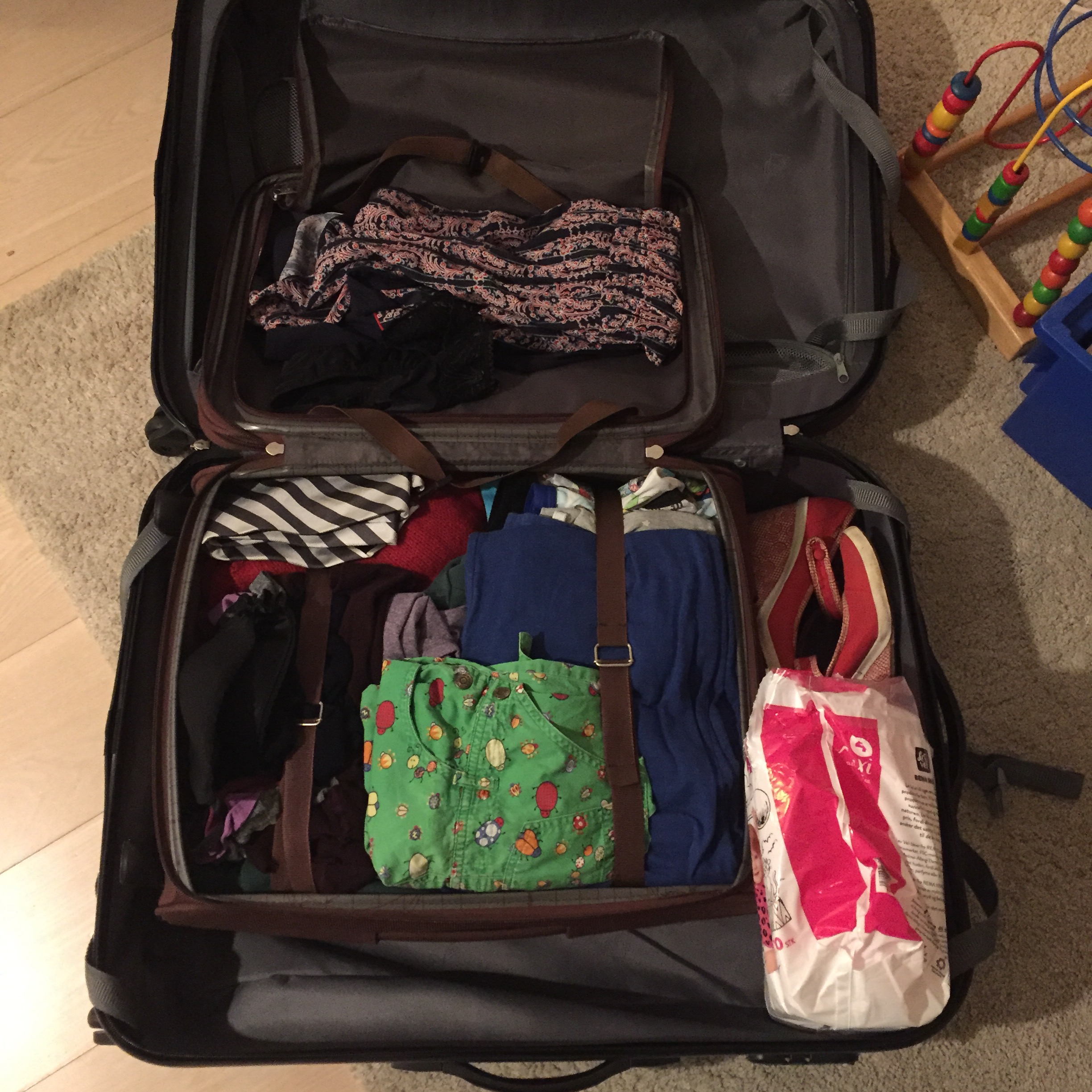 Ich wusch noch eine Maschine Wäsche. Böser Fehler, denn ich verfärbte mir grandioser Weise den Pinguin-Kragen von meinem Selbstgenähten Pulli fleckig rot. Auf dem Einkaufszettel für Deutschland steht jetzt auch Entfärber.Tja, und dann eben Packen. Klamotten in kleinen Koffer in großen Koffer.