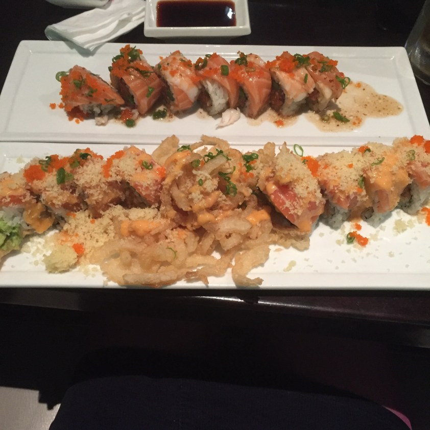 Apropos kann nicht mehr: heute Abend haben wir, also eine Kanadierin, ein Australier, drei Amerikaner*Innen und ich, das Hotel-Abendessen ausfallen lassen und sind Sushi essen gegangen. Es hatte zwar mit japanischem Sushi nichts zu tun, auch nicht mit europäischem, aber gucken Sie mal hier, das ist der Grund weshalb ich auch jetzt, zwei Stunden später, noch fast platze und aussehe wie im 5. Monat schwanger: