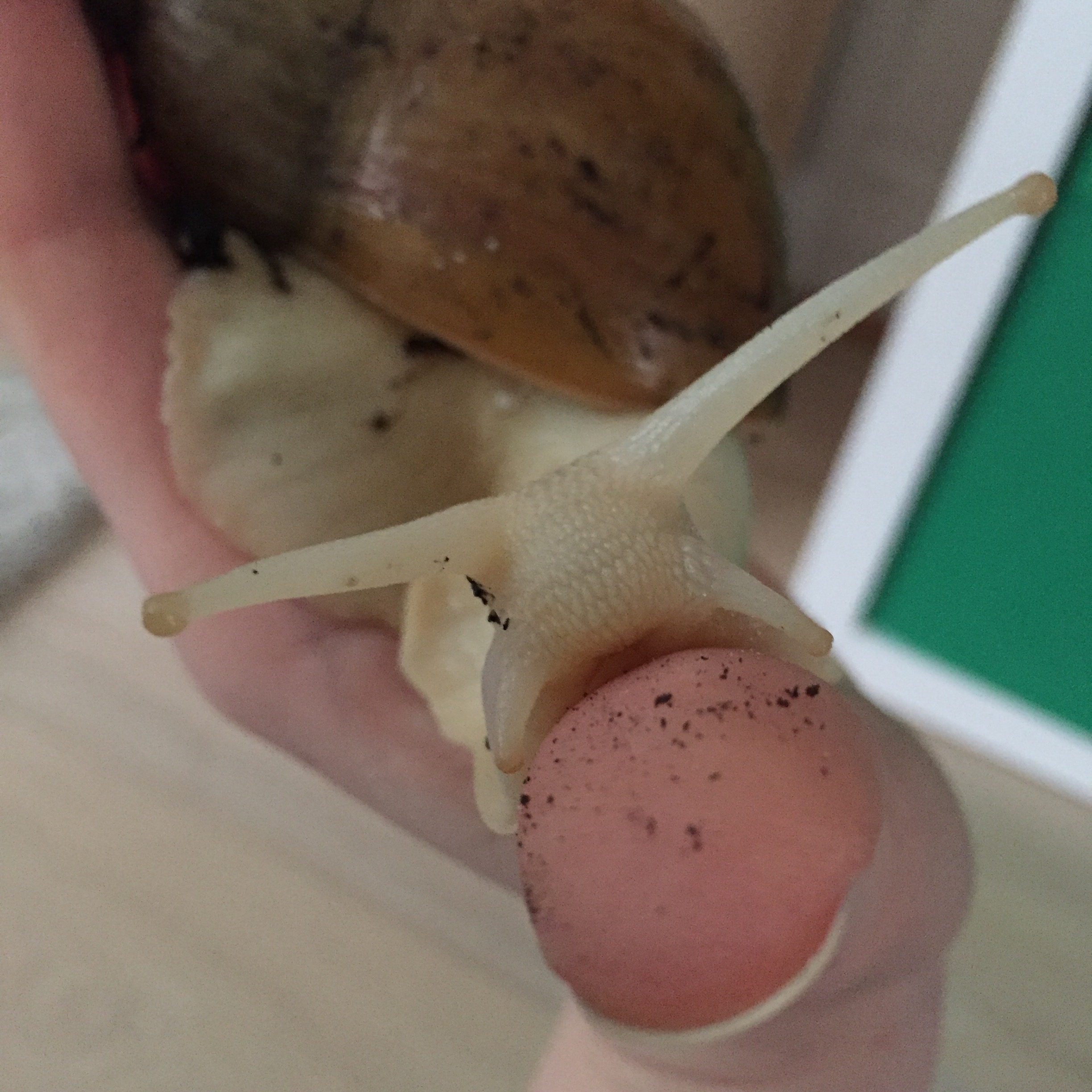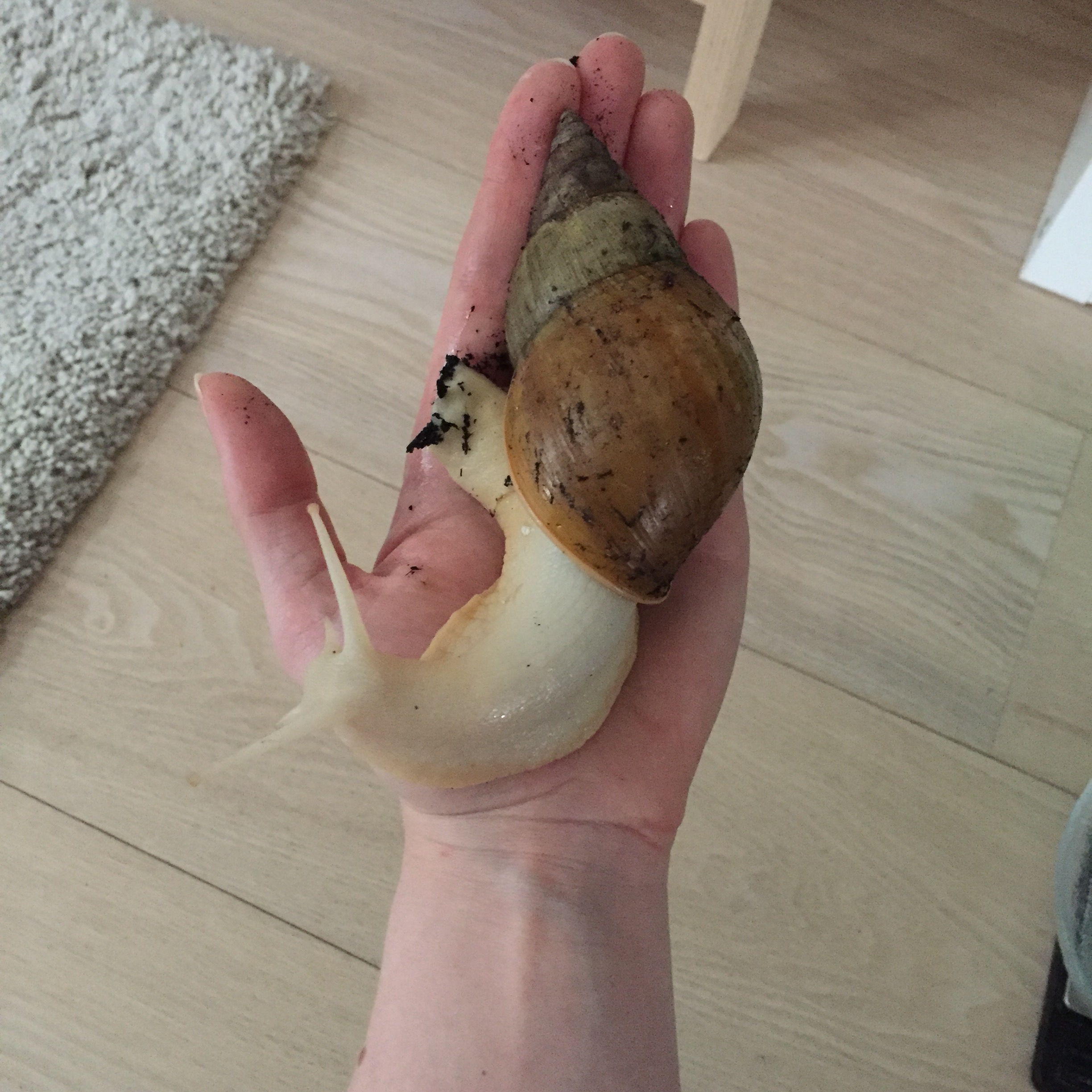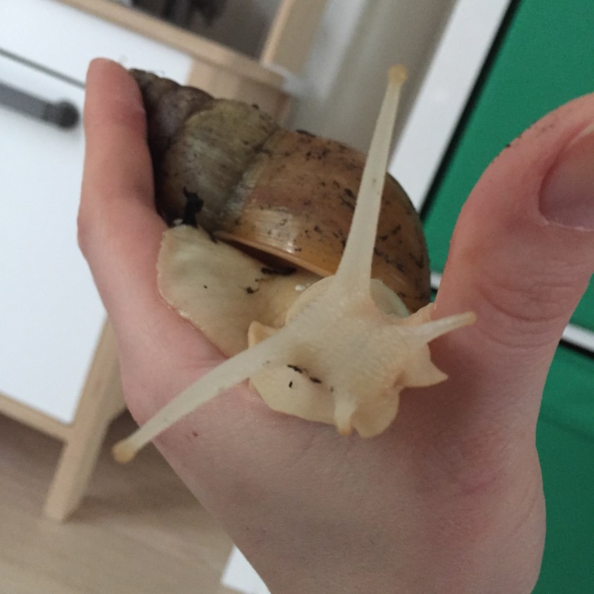 Ich wurde gebeten, mal Schneckenbilder mit Größenverhältnis zu machen. Ich habe es also riskiert, von „Papa-Schnecke“ Sasha gefressen zu werden. Sie hat es auch probiert, aber mit so einer Raspelzunge kann man höchstens ein bisschen kitzeln, mehr nicht.