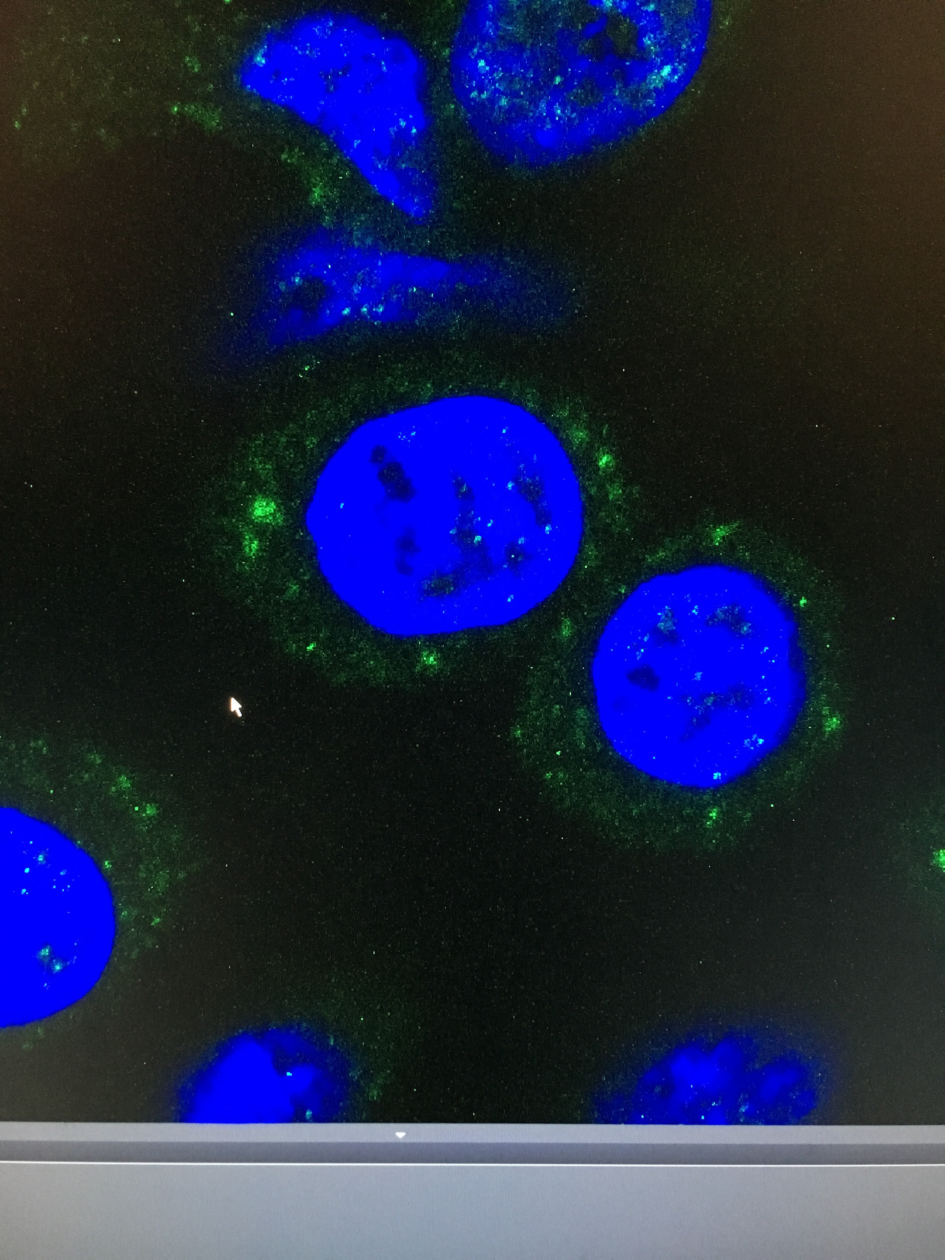 (Geiler neuer Editor, WordPress, aber wie kriege ich denn jetzt Bildunterschriften hin? Egal, also die grünen Punkte, das sind Stress granules. Je gestresster die Zelle, je mehr granules. Die hier sind an der Grenze zum Krepieren gestresst. Gesunde Zellen dieses Typs sind nämlich eigentlich zum Beispiel gar nicht rund.)