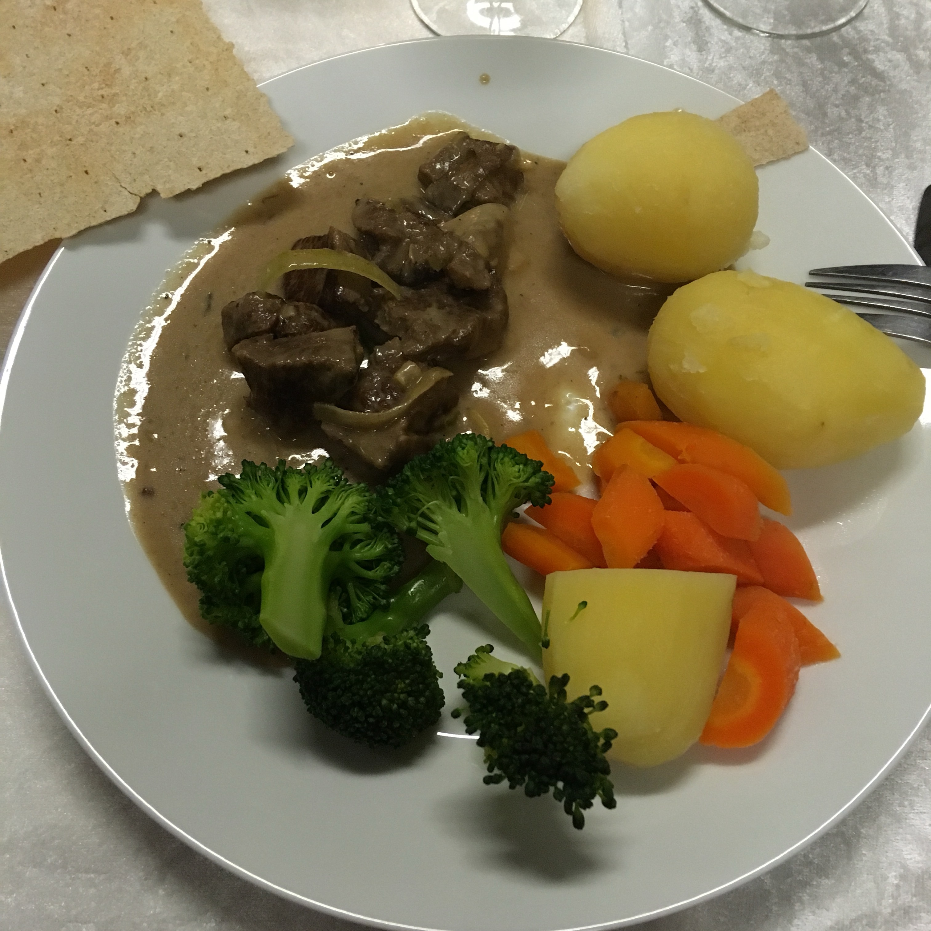Die Mutter der Verteidigenden hat das Essen für die Feier gekocht. Für fast 60 Leute. Elch-, ähh, Gryte halt, aus vom Bruder und Vater der Verteidigendem selbstgejagtem Elch, mit selbst gesammelten Pilzen und Karotten und Kartoffeln vom eigenen Hof. Selbstgemachtes Flatbrød. Nur der Brokkoli war gekauft. Meine Güte, war das lecker.