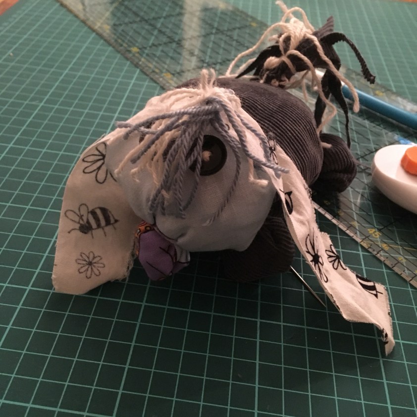 Wir haben vor ein paar Wochen auch ein Ich-bin-ich genäht. Nach Wunsch des Kindes aus rosa kariertem Stoff mit blauen Ohren. Aber die Anleitung ist wohl kaputt. Unsres sieht aus, als hätte es Zahnweh…