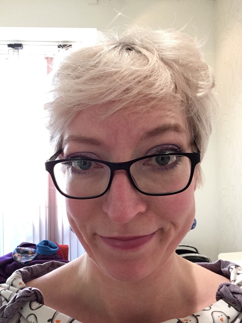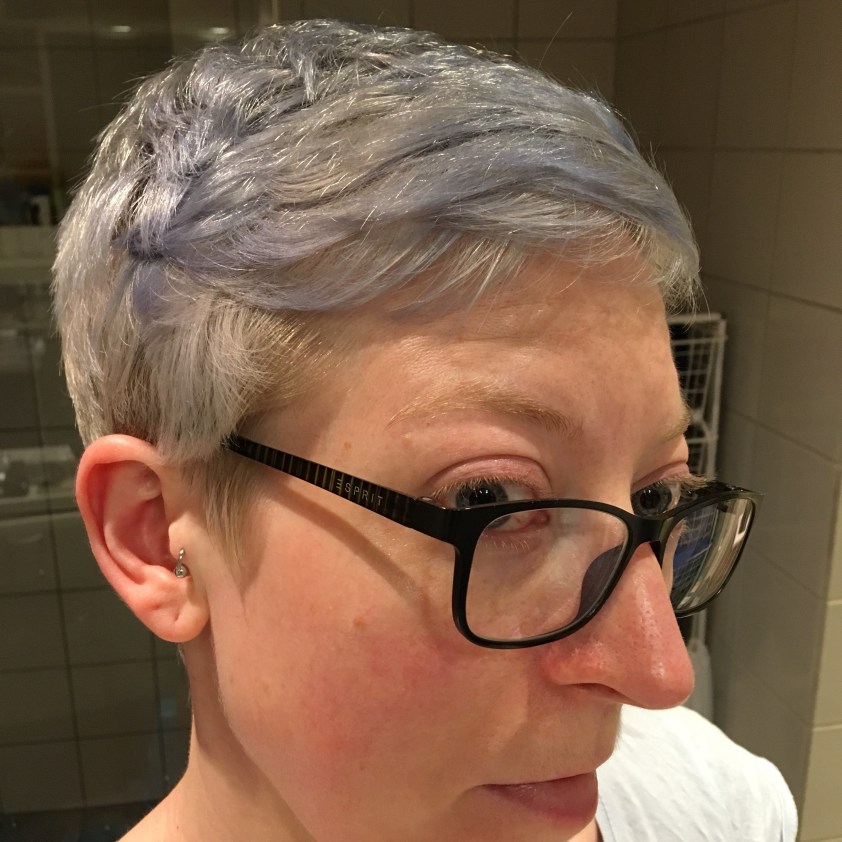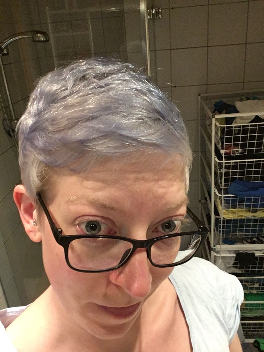 Und dann habe ich heute Abend die gestern nach einer langen Reise durch ferne Länder und (vermutlich mehrere) Kontinente angekommene Haarfarbe ausprobiert. Frau Brüllen hatte die mal gekauft, sich aber dann doch nicht so recht getraut und dann hatte ich gesagt, dass ich die Haare blau färben möchte und zack**, schon hatte** ich die Farbe hier. Bevor Sie jetzt Schnappatmung kriegen: das ist so eine Colorista Wash Out Farbe, wäscht sich also in 5-10 Haarwäschen raus. Ich *muss* also nicht zwingend zur Disputation blaue Haare haben. Heute also auf das frisch gestutzte Haar geschmiert. Nicht auf das ganze, sondern nur „oben“ und den Rest der noch an den Handschuhen war ganz leicht im Resthaar verteilt, ich wollte einen wilden, lebendigen Look und nicht aussehen, als hätte mir ein Schlumpf auf den Kopf gekackt. Bis auf einen Fleck am Hinterkopf ist es mir ganz gut gelungen, finde ich (in echt ist die Farbe intensiver).