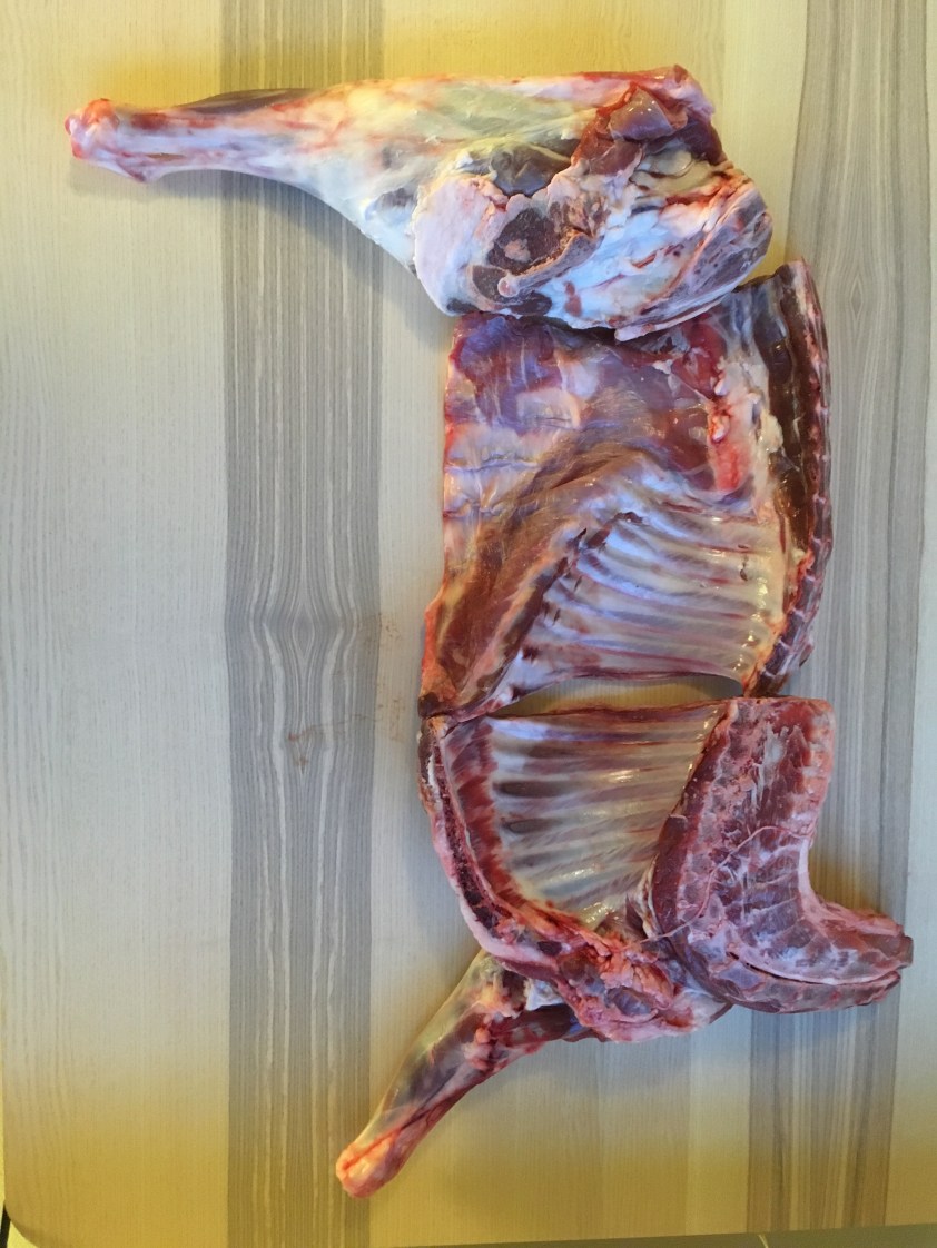 Wir essen ja nicht viel Fleisch und versuchen immer darauf zu achten, dass es nicht aus Massentierhaltung kommt und möglichst tierfreundlich* gehalten wurde. Wir sind hier in Norwegen damit lax geworden, weil es, sobald man seine vier Wände verlässt, immer noch schwierig ist, vegetarisch zu essen, aber wir bemühen uns. In Trondheim haben wir ja unser jährliches halbes Lamm immer vom Schafe-Freund bekommen, hier haben wir jetzt den Bauernhof, bei dem wir ab nächstem Jahr auch Community-farmen werden. Weil das „grob zerlegte“ Lamm in Trondheim immer hauptsächlich kleine und zum Großteil undefinierbare Brocken voller Knochen war, haben wir es hier auch wieder „grob zerteilt“ bestellt, weil ich Angst hatte, „klein zerteilt“ sei dann Gehacktes. Tja, also das hier war wirklich grob.