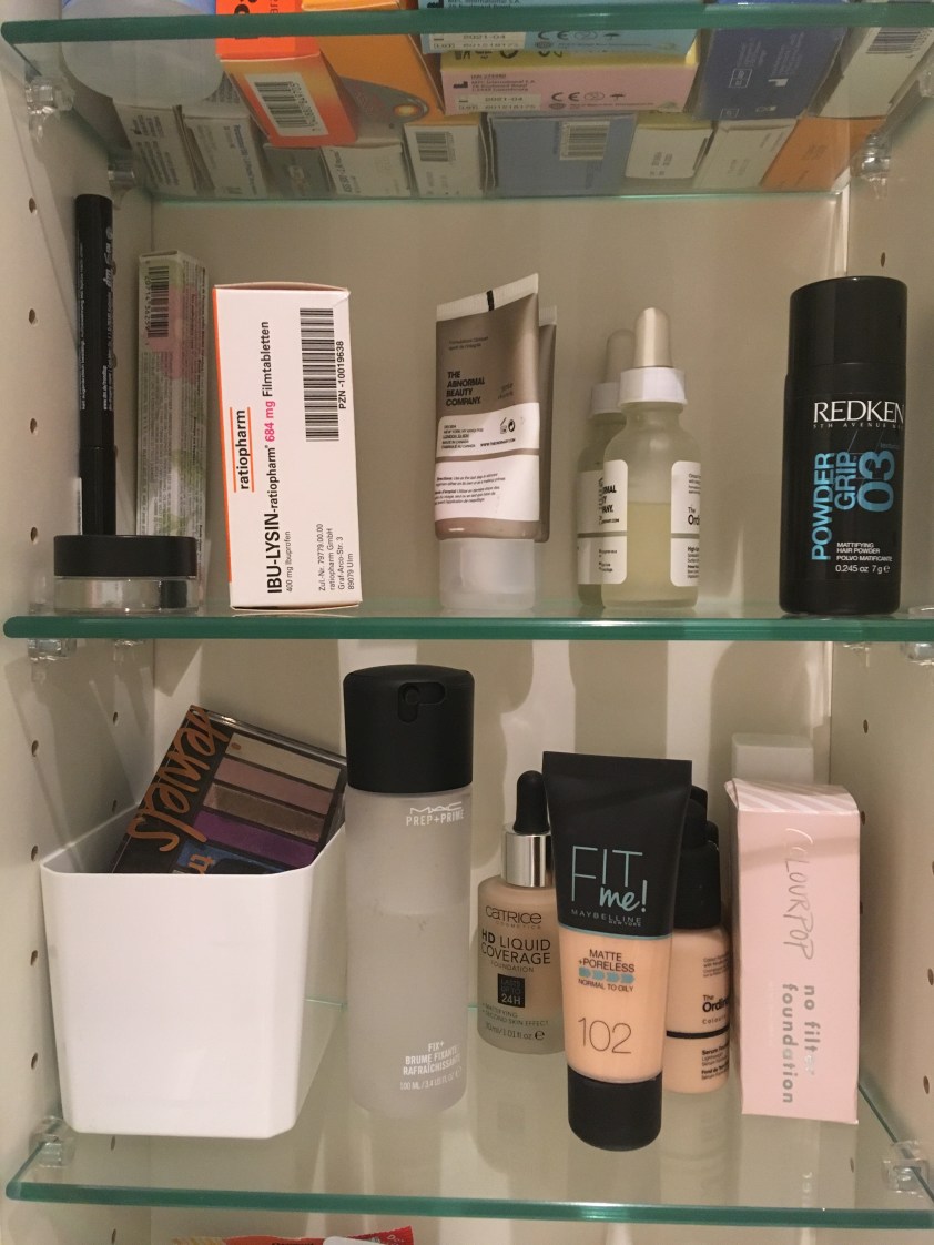 Foundation, Primer, Fixierspray, Haarpuder, Backups, seltsame Lidschattenpaletten, die ich mal kaufte und nach 1 mal Ausprobieren aus Gründen tatsächlich nicht benutze: