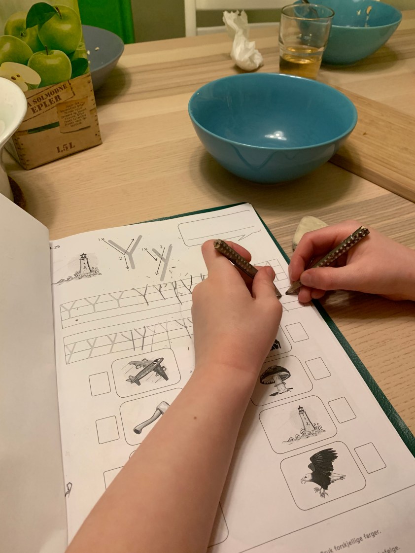 Abends mit Michel Hausaufgaben gemacht und viel Spaß gehabt. Ich sehe das mit den Hausaufgaben ganz entspannt, dadurch geht es auch bei Michel einigermaßen ohne Wutausbrüche. Dafür macht er nur Blödsinn. Tjanun, möchte ich da sagen, nach einem 10-Stunden-Tag in Hort und Schule und dann wieder Hort würd ich vielleicht auch nur noch rumalbern und mal mit beiden Händen oder mit geschlossenen Augen schreiben.