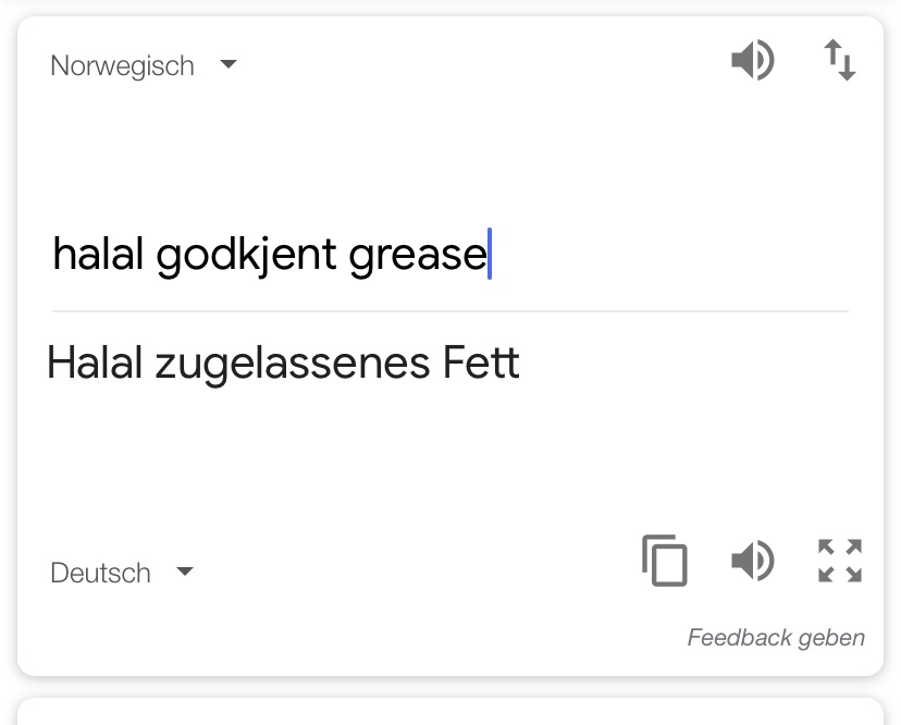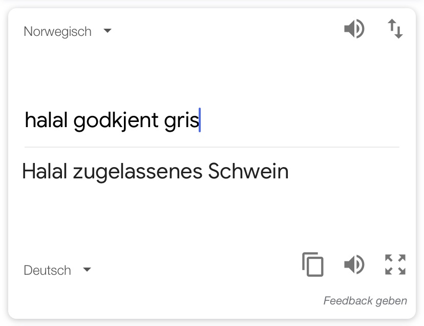 Ich war rechtschaffen verwirrt und fragte: „Ah, ihr habt jetzt also eine andere Sorte gris und das ist halal godkjent?“ „Jaja, das war gar nicht so leicht zu finden!“ war die Antwort. „Kann ich mir vorstellen, ich wusste gar nicht dass es halal godkjent gris gibt!“ Da dämmerte es meiner Kollegin, sie fing an zu lachen und sagte „Moment, ich glaube ihr redet von unterschiedlichen gris. Er redet von grease!“