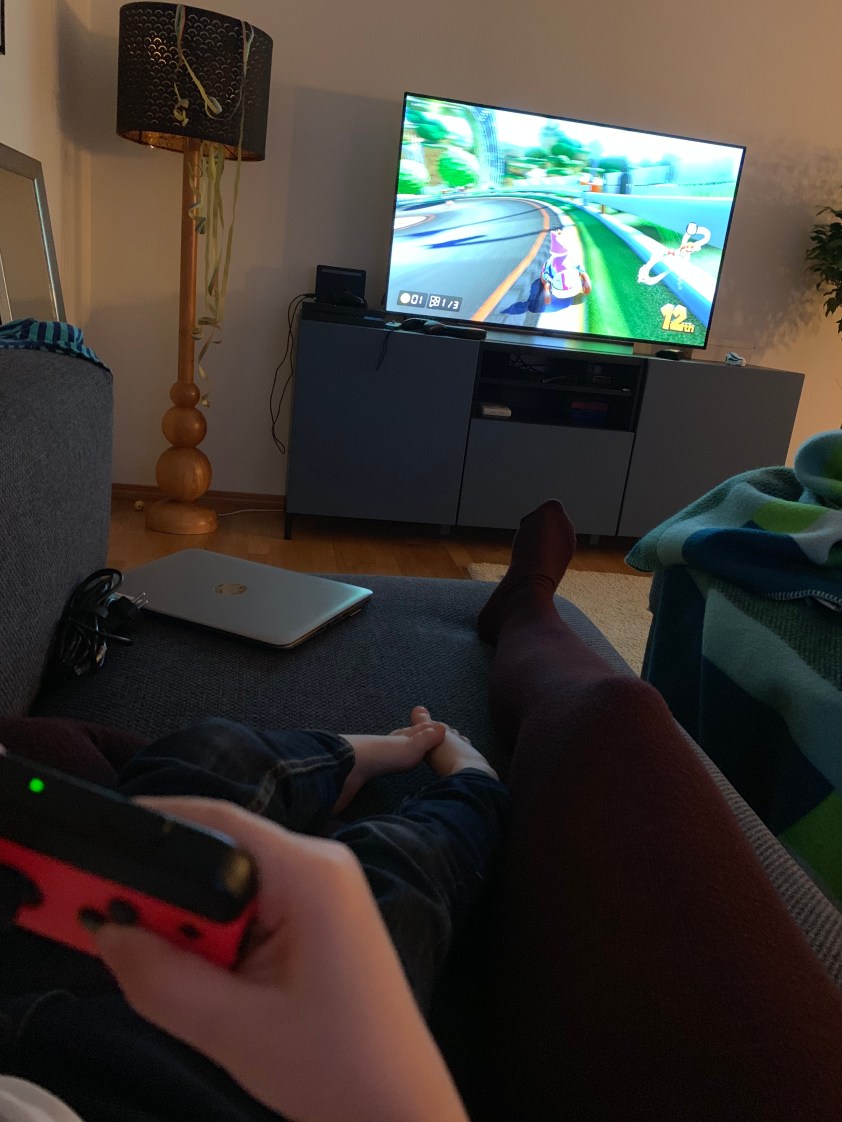 Wir zocken Mario Cart. Genau genommen zocken die Kinder und ich muss immer übernehmen, wenn Sie sich hoffnungslos festgefahren haben. Ich leide ein wenig unter den unterirdischen Mario Cart-Skills meiner Nachkommen. Da geht noch was.