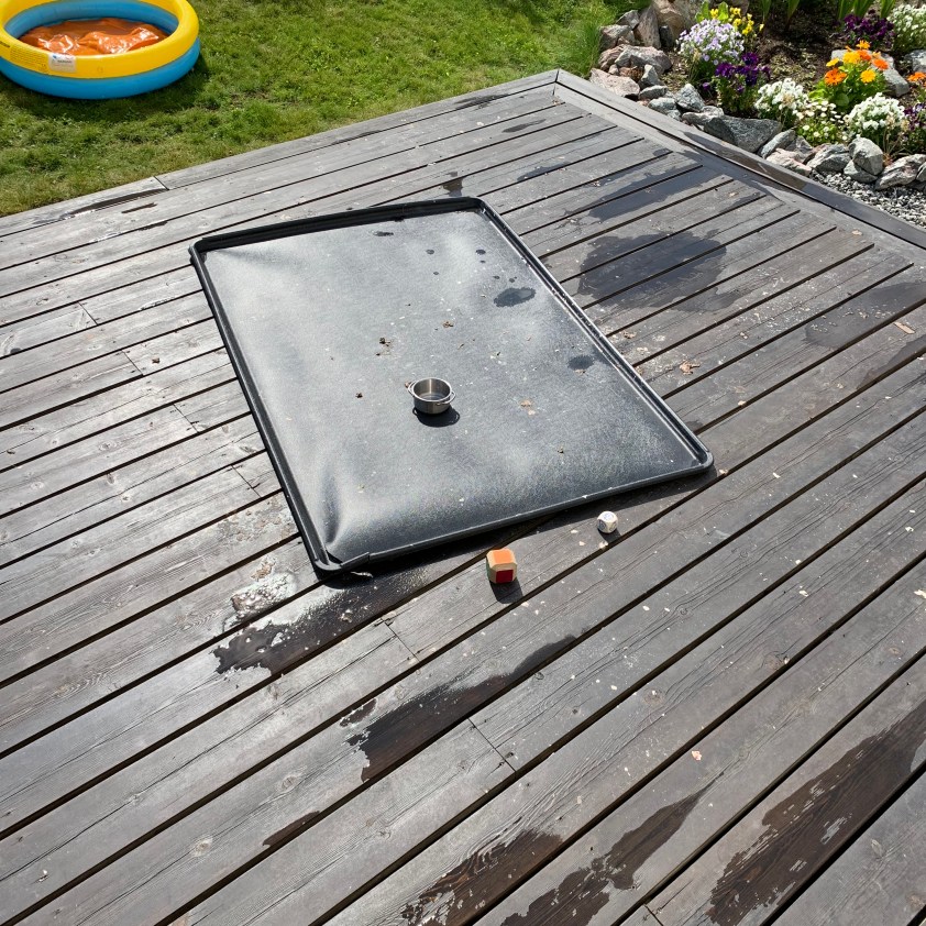 Nun ja. Der Pappkarton war halt auch in die Wasserschlacht integriert worden. Hier schon das Bild, nachdem ich die Kinder angewiesen hatte, die Matsche einzusammeln, bevor sie auf der Terrasse festtrocknet.