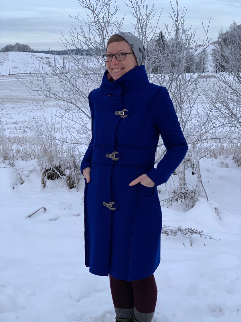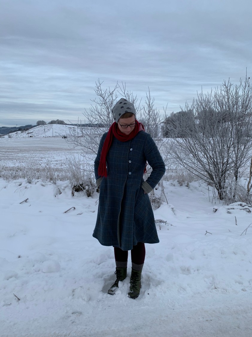 Nun ja. Neuer Anlauf: ich bin zur Zeit nicht nackt. Ich habe mir nämlich zwei Mäntel genäht. Erst den einen, der dauerte ein Jahr, dann noch einen, der dauerte keine zwei Wochen wenn man davon absieht dass ich die zweite Knopfleiste immer noch nicht angenäht habe. Ich fange aus Bildgründen mit dem zweiten Mantel an, nämlich Ingvild: