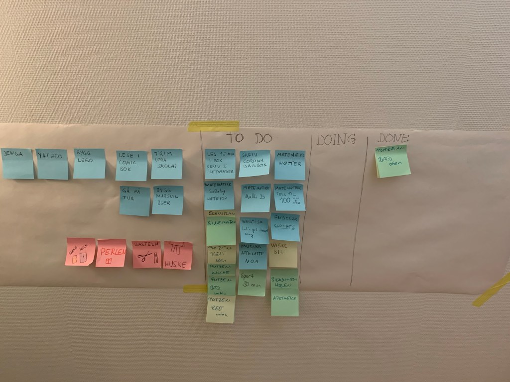 Ein Tag der Anpassungen. (Eigentlich schon die letzten Tage, aber wir setzen es jetzt um.) Der Tagesplan wurde etwas umgestellt, nach einer gründlichen Evaluierung der implementierten Maßnahmen am Wochenende. Und zwar ist jetzt nach dem Essen erst Spaziergang/Draußenzeit FÜR ALLE, dann Aufräumen und dann Medienzeit. Wir erhoffen uns dadurch bessere Compliance bei Draußenzeit und Aufräumen und mehr frische Luft für die Erwachsenen. Auch diese Maßnahmen werden nach einer Woche kritisch bewertet und gegebenenfalls nachjustiert werden.