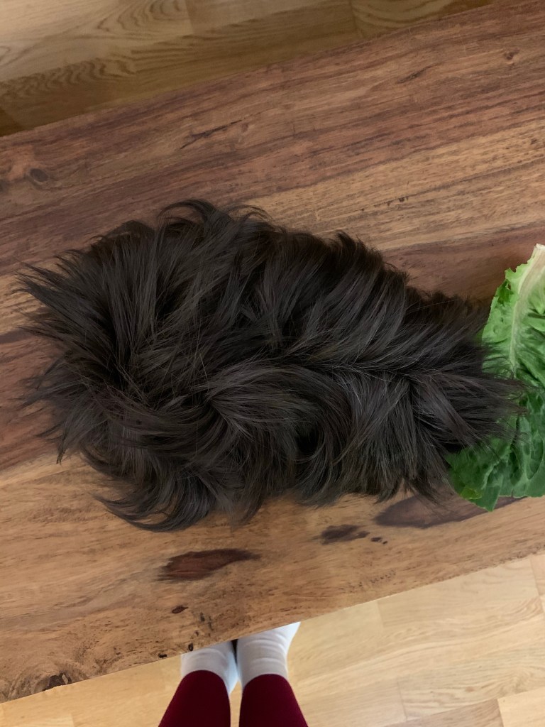 Jetzt wird, nach Rückkehr in die vertraute Kiste, Salat geschnurpst und ich bin sehr zufrieden, weil ich nichts zu beanstanden habe, mit Ausnahme von Muffins nach wie vor verstopfter Talgdrüse, die ihn aber nicht weiter zu belasten scheint. Aber keinerlei Verletzungen, keine Schuppen (die ich nach den Milbenepisoden sehr argwöhnisch betrachte, auch ohne Kratzen) und das ganze Fell ist ganz weich. Hach!