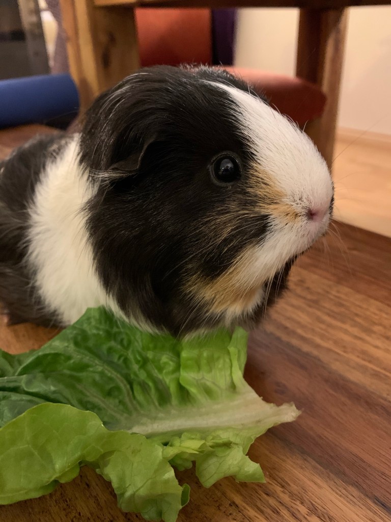Etwas schönes habe ich auch, nämlich dass Muffin das Meerschwein nicht nur des Öfteren liegend, sondern heute das erste mal auch schlafend, mit geschlossenen Augen gesichtet wurde. Das freut mich sehr, denn das heißt, dass er sich bei uns wohl und sicher fühlt und die Rangordnungskämpfe wohl beigelegt sind. Man sieht ihm ja schon länger immer mehr an, dass es ihm gut geht, er hat jetzt so ca. doppelt so viel Fell wie als er zu uns kam. Vor allem sieht das Fell auch gesund aus, es glänzt und die Schuppen sind verschwunden. Dazu hat er ordentlich an Gewicht zugelegt und ist jetzt so schwer wie die Ladies (wirkt aber wegen des vielen Fells viel massiver). Dass er nur 850 g wog, als er hier einzog, macht mich nachträglich immer noch traurig.