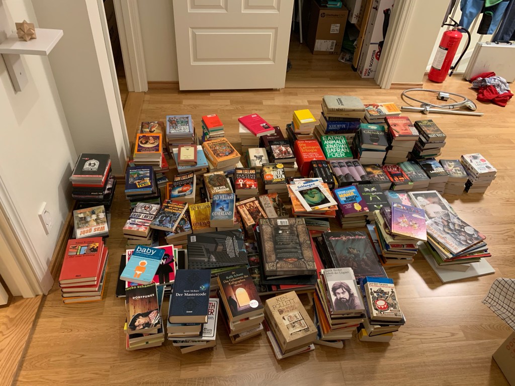 Hier übrigens der Bücherhaufen. Wir müssen auf etwa 1/4 davon runter.