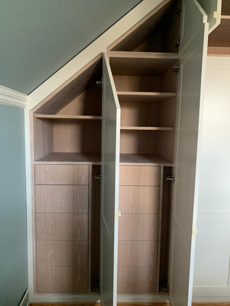 Der Schrank, auf dessen Scharniere und Schubladenauszugsleisten wir gefühlt ewig gewartet haben, ist endlich da und zu 95% fertig. Es fehlen noch Türgriffe (ups, vergessen), Beleuchtung von innen, eine Schublade muss etwas weniger tief gemacht werden, weil dahinter eine Steckdose ist und die ganzen Leisten müssen wieder dran. Für all das kommt der Tischler also noch mal wieder. (Im Rahmen unserer Coronaregeln war das alles komplett legal, fühlt sich trotzdem seltsam an, aber es fühlt sich auch nicht gut an, zugesagte Aufträge an Selbständige rauszuschieben. Momentan macht man es halt immer irgendwie falsch. Das darf bald auch mal wieder anders werden.)