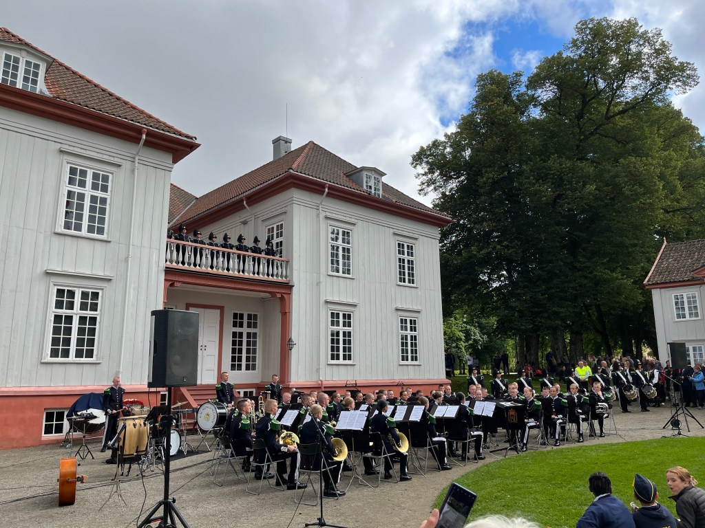 Jedenfalls war heute „Musikfest im Park“, was vom Titel her vielleicht ein falsches Bild vermittelt, denn es war Korpsmusik am Eidsvollbygningen. Das ist ja ein sehr ehrenwürdiges Gebäude, in dem 1814 die norwegische Verfassung unterschrieben wurde und da ist es schon auch schön, man kann da unter anderem überaus gut spazieren gehen und/oder Pokémon fangen. Wir allerdings MUSSTEN da hin, weil der Schulkorps da hin musste. Unsere Kinder sind ja „nur“ Aspirant und Rekrut, spielen also noch nicht mit, marschieren aber und stehen, während der Hauptkorps spielt, dekorativ rum (Pippi tanzend und ihre Troddel an der Mütze propellern lassend, Michel mit dem Gesichtsausdruck eines routinierten Begräbnisunternehmers). Trotzdem mussten sie hin. Außerdem hatte mein Lieblingskollege gesagt, wenn ich mal nen richtig guten Korps sehen Wolle, solle ich auf jeden Fall die Garde anschauen. Nach den ganzen Eidsvoller Schulkorpsen und Erwachsenenkorpsen spielte nämlich die 3. Kompanie der Königlichen Garde, was, wie Wikipedia verrät, eine der weltweit besten Marsch-, Drill- und Konzertkapellen ist. Jaha. Wie, Drill sagt ihnen nichts? Mir auch nicht, bis vorhin.