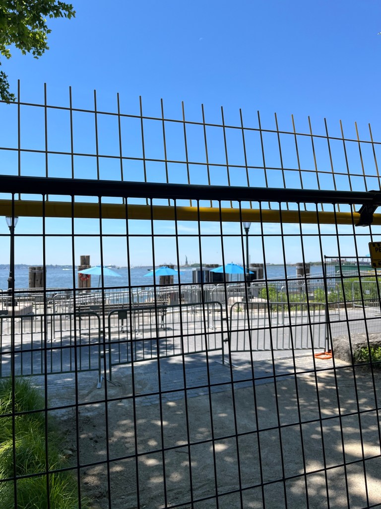 Aber dann kann ich ja erzählen, wie letztes Wochenende war. Ansonsten habe ich ja nur inspiziert, das war für Sie langweilig und für uns vor Ort viel spannender, als wir gedacht hatten. Aber dann war Samstag und wir fuhren nach New York. Es war morgens schon super warm und ich hatte meinen Kram zum Übernachten auf das eingedampft, was in meinen (kleinen) Arbeitsrucksack passt, weil ich den tagsüber rumschleppen musste. Die deutschen Inspektoren wollten sich ja mit „Familie“ treffen, was sich als ein Onkel rausstellte, der vorschlug, eine Hop on, Hop off Bustur zu machen. Das kann ich empfehlen. Wir fuhren erst mal eine Runde durch Downtown Manhattan, bis da hin wo die Fähren nach Ellis Island fahren. Wenn Sie die Freiheitsstatue sehen wollen, lassen Sie das, da hin zu fahren, oder nehmen Sie tatsächlich das Boot. Weil sonst stehen Sie bloß an einem Zaun.