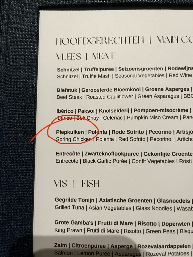 Lacher des Tages: im Hotelrestaurant gab es „Piepkuiken“. Niederländisch ist schon eine sehr lustige Sprache.