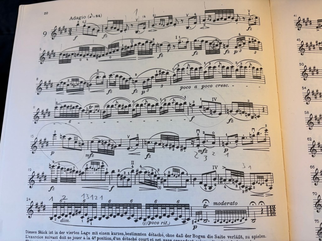 Ohne die ganzen Vorschläge und kleinen Noten habe ich jetzt, glaube ich, die ersten vier Zeilen Rhythmisch verstanden. Hurra. Aber das Zählen ist allein schon ne Herausforderung und dann kommt noch dazu, dass mein Bogen gar nicht vier Meter lang ist. Die Markierungen sind übriges von meinem Geigenlehrer, aus Zeiten, wo er selbst daran arbeitete. Das ist sein Buch, ich darf das leihen. Rode 24 Capricen ist das, und die sind überraschend schön, aber wirklich hart.