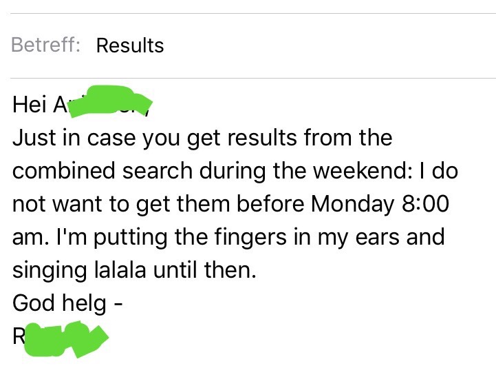 – Einen Anruf bekommen. „Hallo, hier die Stockholmer. Wir möchten Dir den Job gerne anbieten. Wir bieten Ihnen Xtausend Kronen an, das ist nicht besonders viel, aber, hmm, ja doch irgendwie… angemessen, mit PhD und, ja, also wir würden uns freuen, wenn du zusagst, schlaf mal drüber und meld dich in ein paar Tagen.“