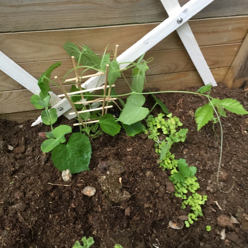 Zuckererbsen draußen (nachdem die Minigurke schon seit ein paar Tagen versuchte, das kleine Sukkulentenbäumchen auf der Fensterbank mit ihren Festhalteschnurpseln zu erwürgen).