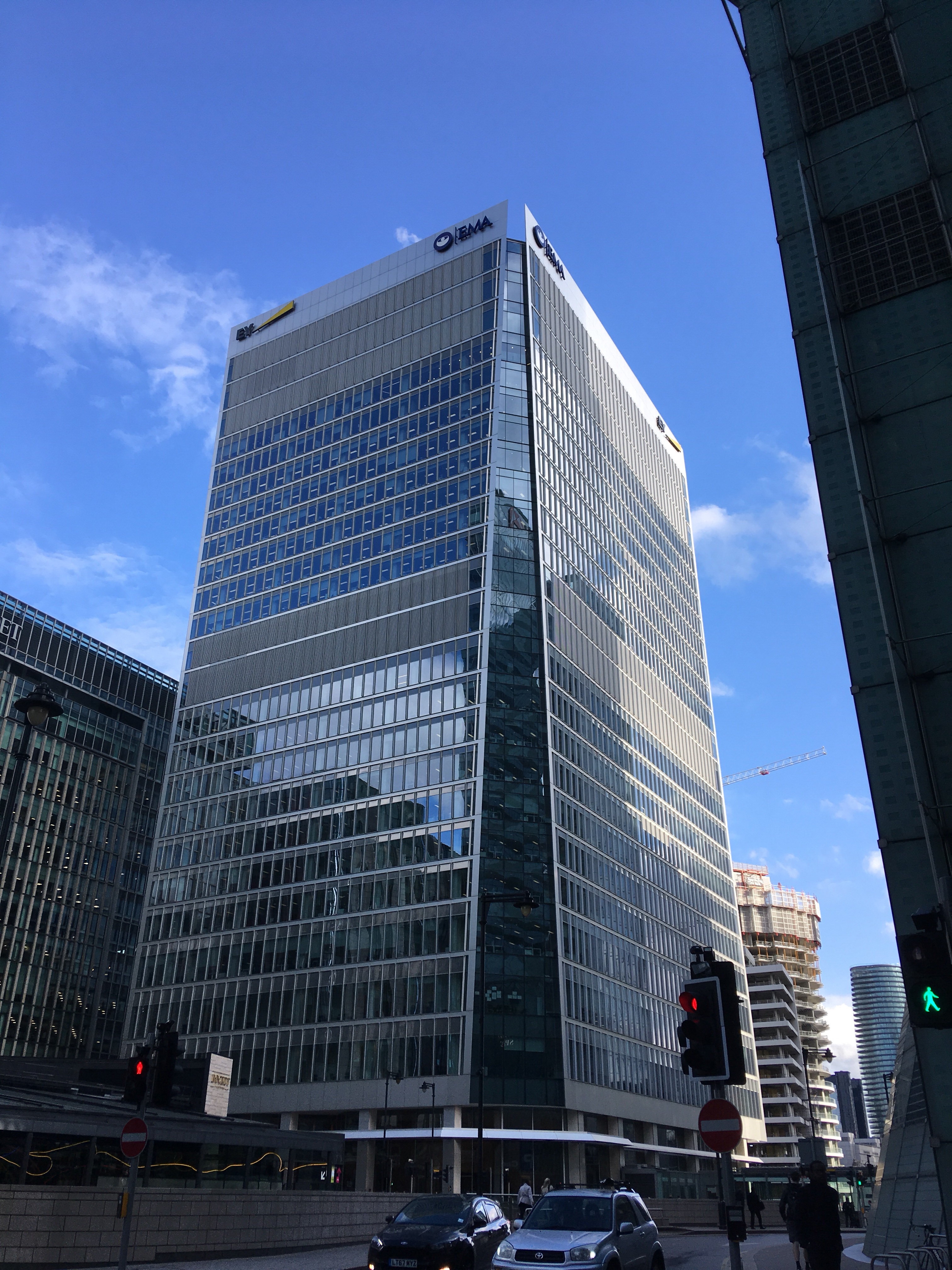 Canary Wharf. Ich wusste gar nichts über diesen Ort und fand mich nach einem Spaziergang von meinem Hotel im erkennbar nicht-reichen Poplar zwischen glänzenden Hochhäusern, Sicherheitspersonal, Durchfahrtsperren für kleinere Panzer und unfassbaren Mengen an Anzugträgern wieder. „Nettes Café suchen“ war mein Plan, wär bestimmt auch gegangen, würde ich Cafés voller geklont aussehender Männer um die 40 irgendwie nett finden. Das ist ja Geschmackssache. Im Endeffekt kaufte ich mir dann im einem Feinkostgeschäft zwei Bananen und zwei 0,5 L-Flaschen Wasser und setzte mich mitten im Einkaufzentrum an so ein „Husch husch, schnell ein Salätchen in der Mittagspause holen“-Büdchen. Immerhin hatten die vernünftigen Kaffee.