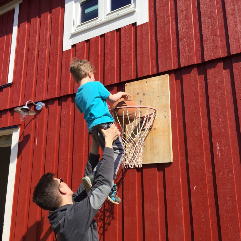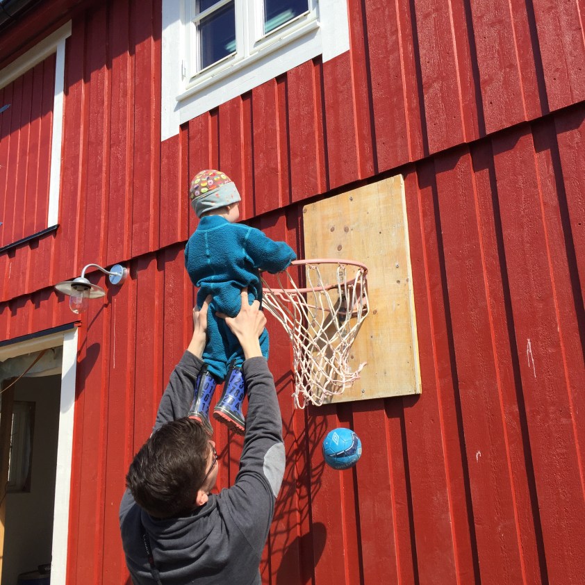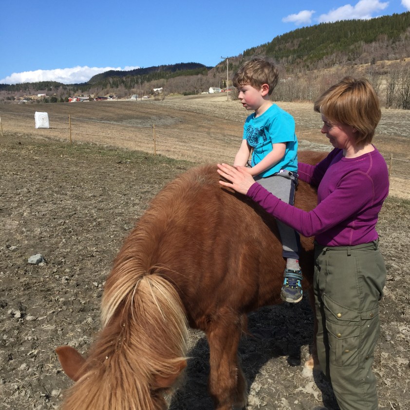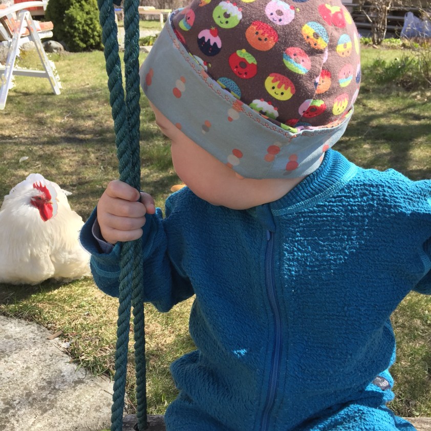 Als wir ankamen, staunte ich wirklich nicht schlecht: K. hat nicht nur Pferde, sondern einen richtigen Hof. Freilaufende, äh, Flauschhühner begrüßten uns, Pippi geriet total aus dem Häuschen und rief erst „Gagagei!“ und dann nach Aufklärung „Kikiki!“ und „Pook, pook, poooook!“. Michel freundete sich mit Sara, dem Minischwein an und fütterte es mit Waffeln (das durfte er, wir haben gefragt). K. zeigte alles den Kindern, Michel durfte sogar auf dem einen Pferd sitzen (die Teeniemädchen waren nicht da) und das totale Highlight war, als es aus dem Hühnerhaus plötzlich laut und ausdauernd zu gackern anfing und K. zu Michel sagte „Weißt du, was jetzt passiert ist? Jetzt hat ein Huhn ein Ei gelegt!“ und ihn mitnahm, das Ei zu holen. Michel war unglaublich beeindruckt, es waren sogar zwei Eier und er bekam die Eier geschenkt, weil er so toll mitgeholfen hatte. Stolz wie Oskar trug er seine Trophäe herum und passte wirklich gut drauf auf, dass den Eiern bloß nichts passiert. Pippi lernte ein paar neue Worte, nämlich „jaukeln“ (schaukeln), „Hahn“, „Huhn“, Fääät“ (Pferd) und „hest“ (norwegisch für Pferd), „grisen“ (norwegisch für Das Schwein) und natürlich „Waffen“ (Waffeln). Und das ganze bei strahlendem Sonnenschein und 17 Grad. Ehrlich, es war so schön, dass mir vor lauter Harmonie lauter Schimpfwörter im Kopf herumirrten, als Kompensation sozusagen. „Scheiß die Wand an, ist das schön hier.“ Vielleicht war ich zu lange in Westfalen.
