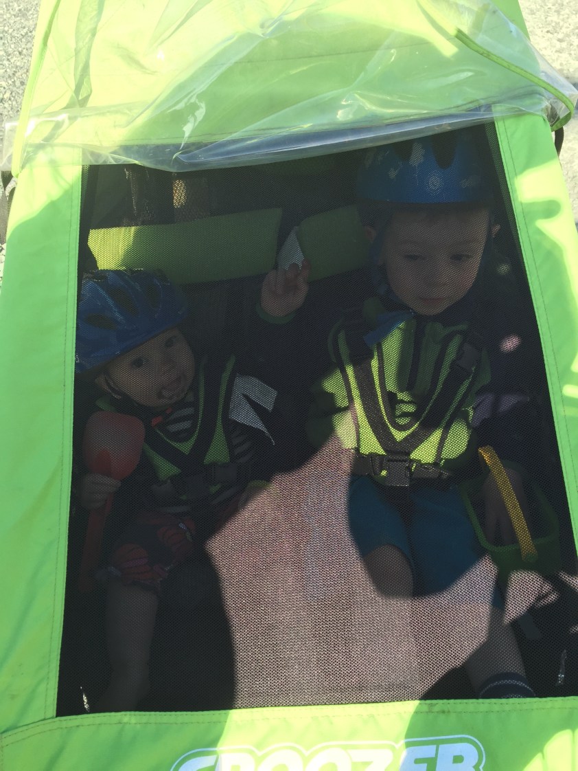 Wir haben heute die erste Tour mit dem Fahrradanhänger gemacht. Michel, Pippi und ich, denn Herr Rabe musste fertig putzen. Das Putzen war ziemlich überfällig und dauerte deshalb schon den halben Tag, plus einen halben Tag Bäckerei (Pflaumenkuchen, Brötchen und Brot), da war meine Laune schon echt im Keller (wie ich putzen hasse. Echt. Kann es nicht endlich September sein und zwei volle Gehälter reinkommen und wir uns eine Putzhilfe suchen?). Der Ausflug kam da wie gerufen. Es war natürlich auch total aufregend für alle, ich mit dem schweren Ding hinten dran und dann gleich mit der kostbarsten Fracht. Zuerst mussten wir leider feststellen, dass der Hänger echt nur grade so durch die Tür passt. Ich muss also erst die Kinder fertig machen (Pippi sieht mit dem Fahrradhelm aus wie ein Super Mario Toad, das ist sooooo niedlich!) und in den Hänger setzen, dann das Fahrrad rausbringen, dann den Hänger samt Kindern rausbringen, dann den Hänger draußen ans Rad hängen und los geht’s.