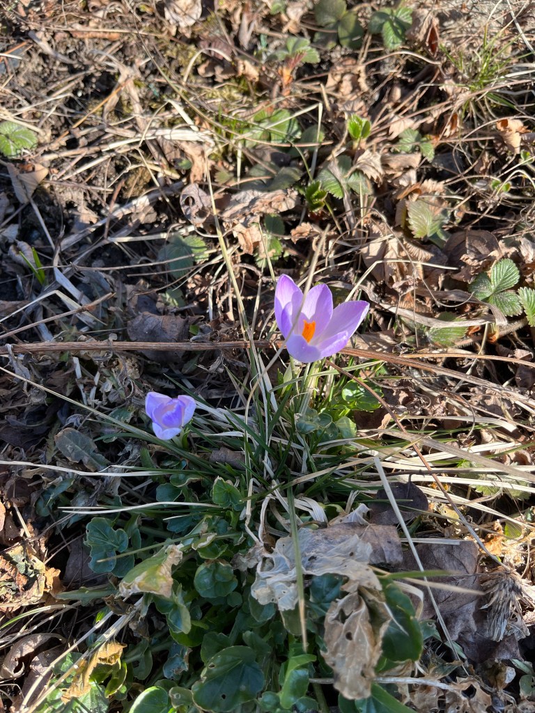 Zwei Krokusse und sich unkrautartig ausbreitende Walderdbeeren (die dürfen das da gerne tun)