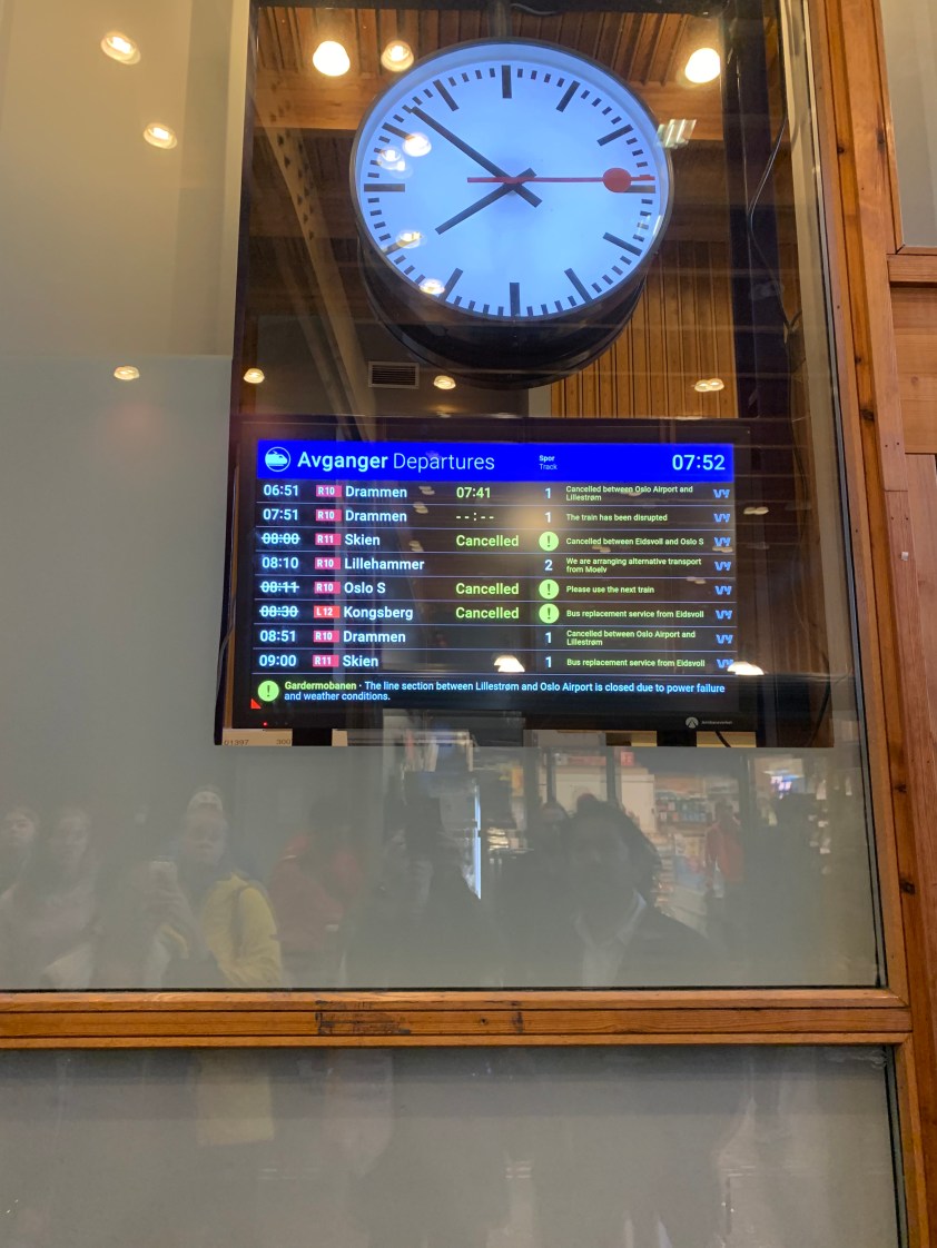 Uff, der Tag war objektiv betrachtet echt nicht so der Knüller. Dafür bin ich da noch halbwegs elegant durchgesegelt, finde ich. Alles begann damit, dass ich um fünf Uhr morgens fast aus dem Bett gefallen wäre, weil es draußen so hell geblitzt hat, dass ich es durch die Lamellendinger und Gardinen im Schlaf wahrgenommen habe. Ein paar Sekunden später ein riesiger Knall, gefolgt von einem Rumpeln und dann prasselnder Regen. Ein Gewitter. Aber was für eins. Natürlich stand kurz drauf Michel im Schlafzimmer und hatte ein bisschen Angst und als wir alle aufstanden, wachte auch Pippi auf. Die Kinder fragten sich dann, wieso es draußen so dunkel ist (naja, Gewitter halt) und Michel wollte gerne wissen, wie oft es wohl blitzen würde. Das wusste ich nicht, aber es war einmal zu oft, bzw. einmal an einer üngünstigen Stelle, nämlich irgendwo zwischen Flughafen und Kløfta, also auf unserer Bahnstrecke, in irgendwas für die Züge wichtiges. Das wiederum erfuhren Herr Rabe und ich als wir um fünf vor halb acht am Bahnhof standen – und da merkwürdigerweise ein Nachtzug stand, der auch nicht weiter fuhr. Die Anzeigen dann alle so: