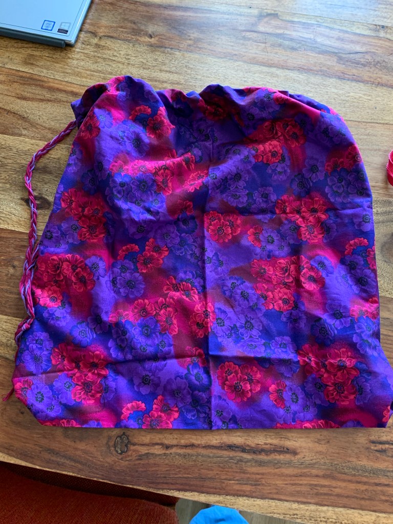 Michel hatte heute keinen Sport-Hort, sondern eine Ferienaktivität des Handarbeitsvereins. Das war anfangs wegen Rabeninterner Kommunikationsschwierigkeiten etwas holprig, aber er ist dann doch da geblieben mit der Aussicht auf Schnitzen. Und siehe da: er fand es super gut und noch besser als das Schnitzen war das Nähen. Er hat sich einen Turnbeutel gemacht, in seinen Lieblingsfarben. (Turnbeutel war vorgegeben, Stoff durften sie aussuchen, Kordel wurde selbst geflochten.) Weitere Ausbeute: diverse Lesezeichen, ein geschnitzter Zauberstab und ein gestickter Smiley.