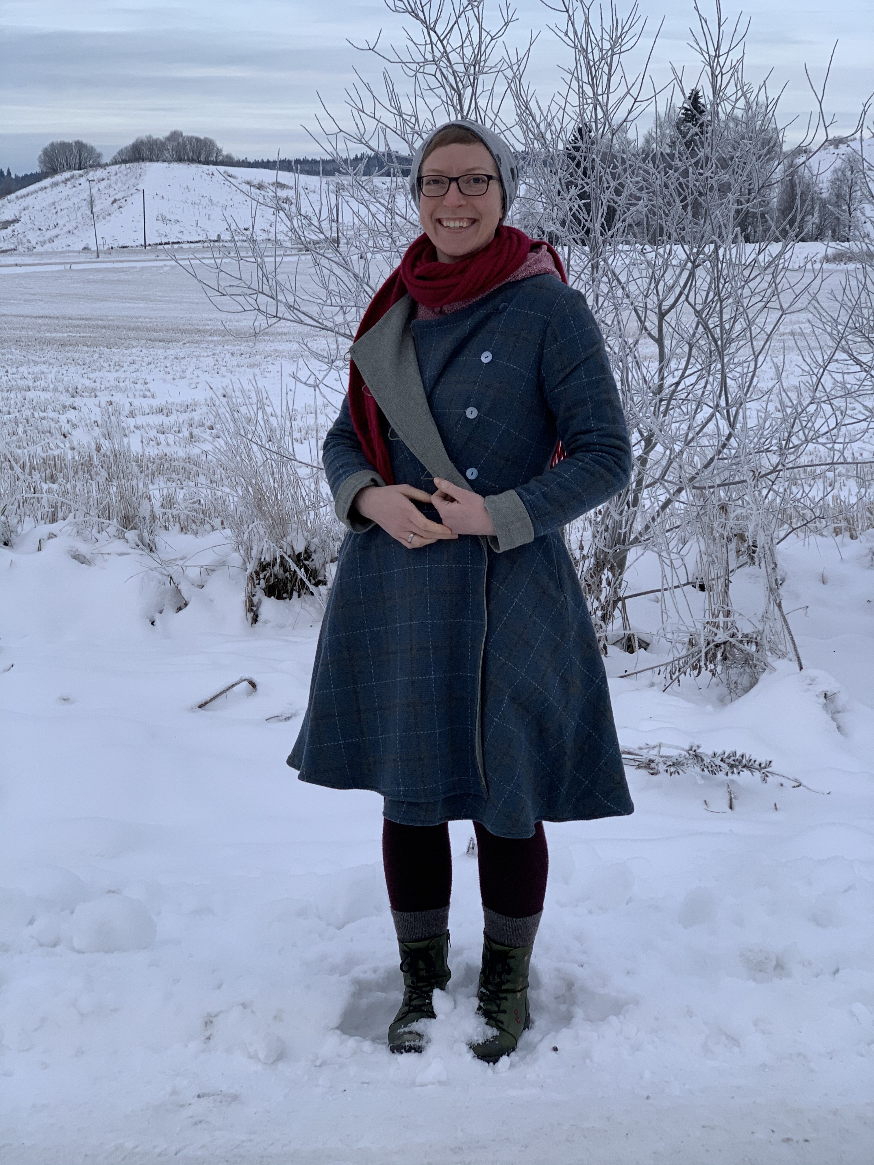 Nun ja. Neuer Anlauf: ich bin zur Zeit nicht nackt. Ich habe mir nämlich zwei Mäntel genäht. Erst den einen, der dauerte ein Jahr, dann noch einen, der dauerte keine zwei Wochen wenn man davon absieht dass ich die zweite Knopfleiste immer noch nicht angenäht habe. Ich fange aus Bildgründen mit dem zweiten Mantel an, nämlich Ingvild: