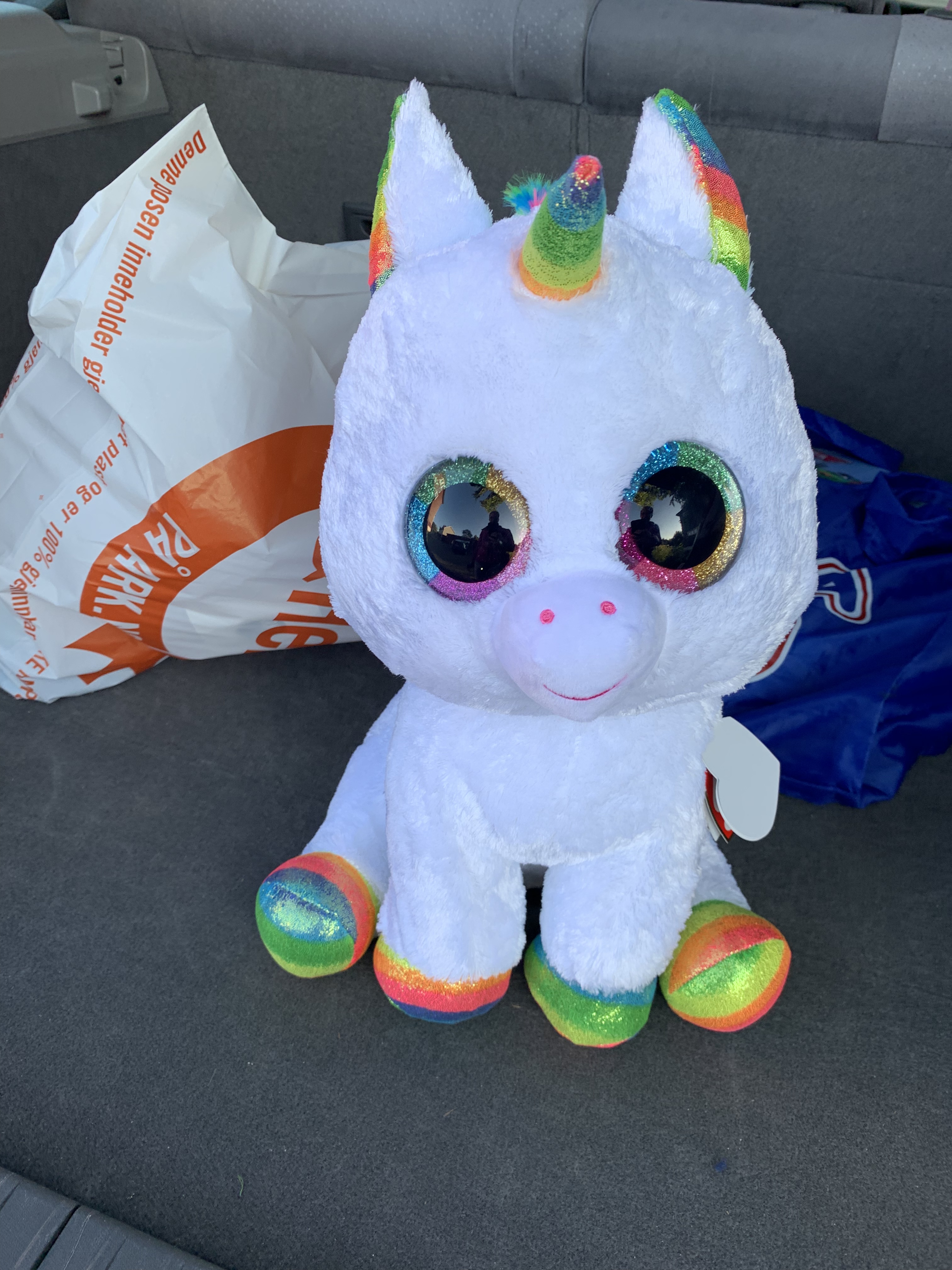 Finde ich das schön? Nein. Habe ich ihr das gekauft? Ja. Warum? Sie wird ausrasten vor Freude. Das ist alles was zählt: diesem kleinen, eigensinnigen, wunderbaren Mädchen den Wunsch nach einem riesigen Glitzer-Einhorn erfüllen.