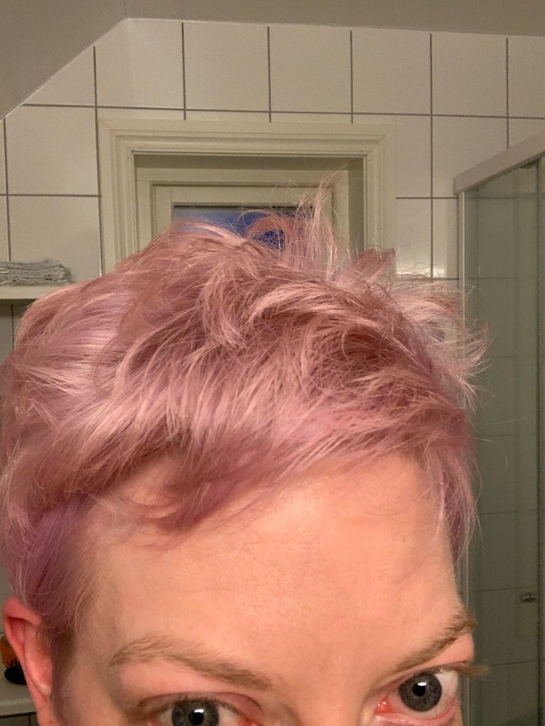 Meine Haare sind jetzt wieder lila. Nur doller als letztes Mal, weil ich aus Versehen „Violet“ statt „Lilac“ bestellt habe (wahrscheinlich wegen des Lilla) und bevor Sie es sagen: das *ist schon* das Ergebnis mit 50% Conditioner. Ähäm. Hoppla.