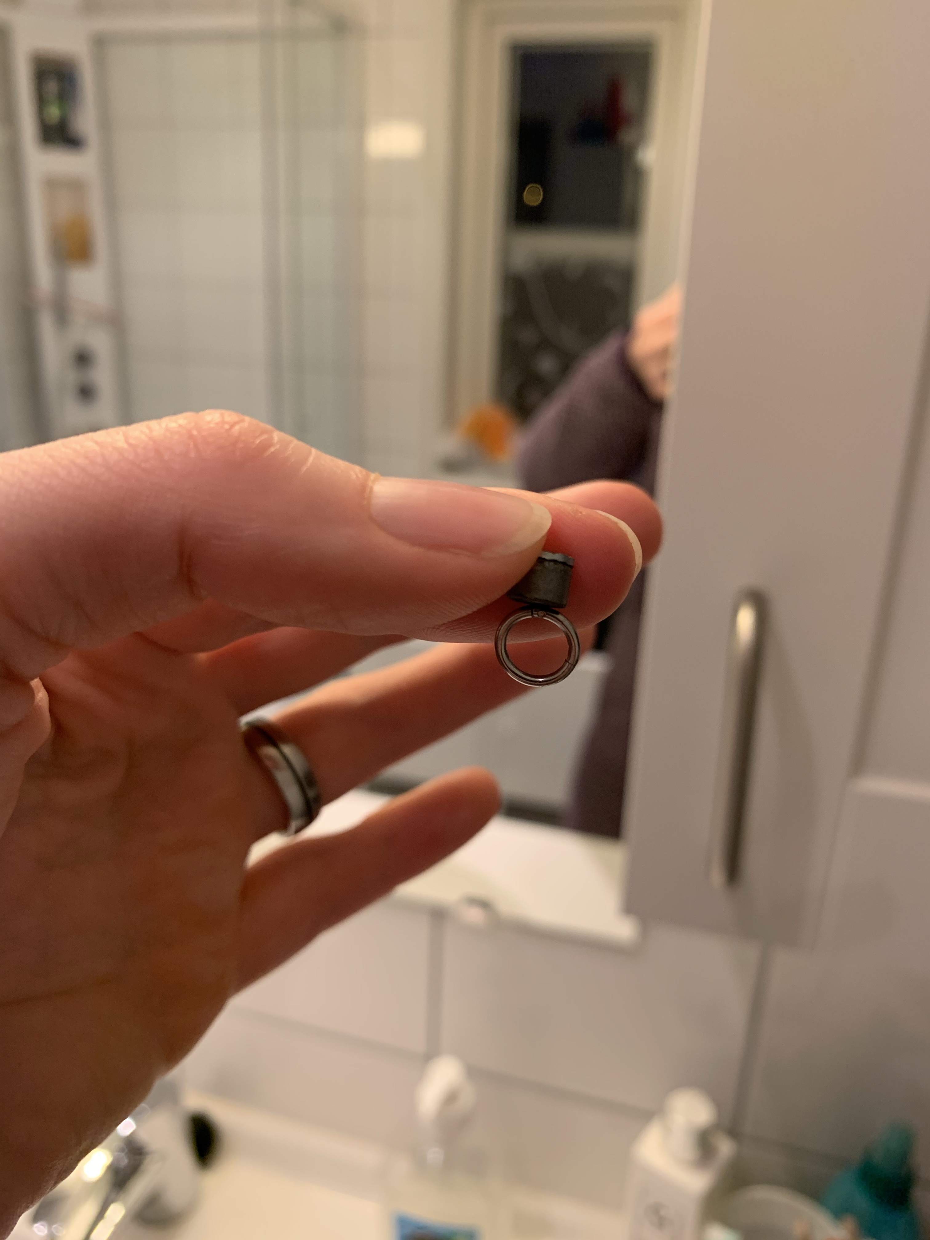 Der Ring an sich ist aus Chirurgenstahl und nicht magnetisch, aber das Schließsegment ist mit einem winzigen Scharnier angebracht und das ist offenbar aus einem magnetischen Metall. Das hätte morgen echt weh tun können.