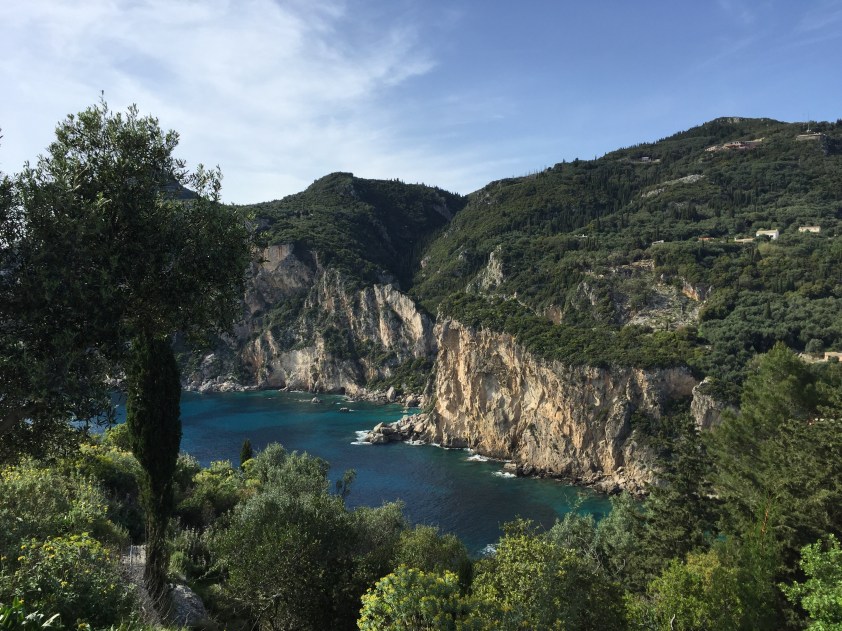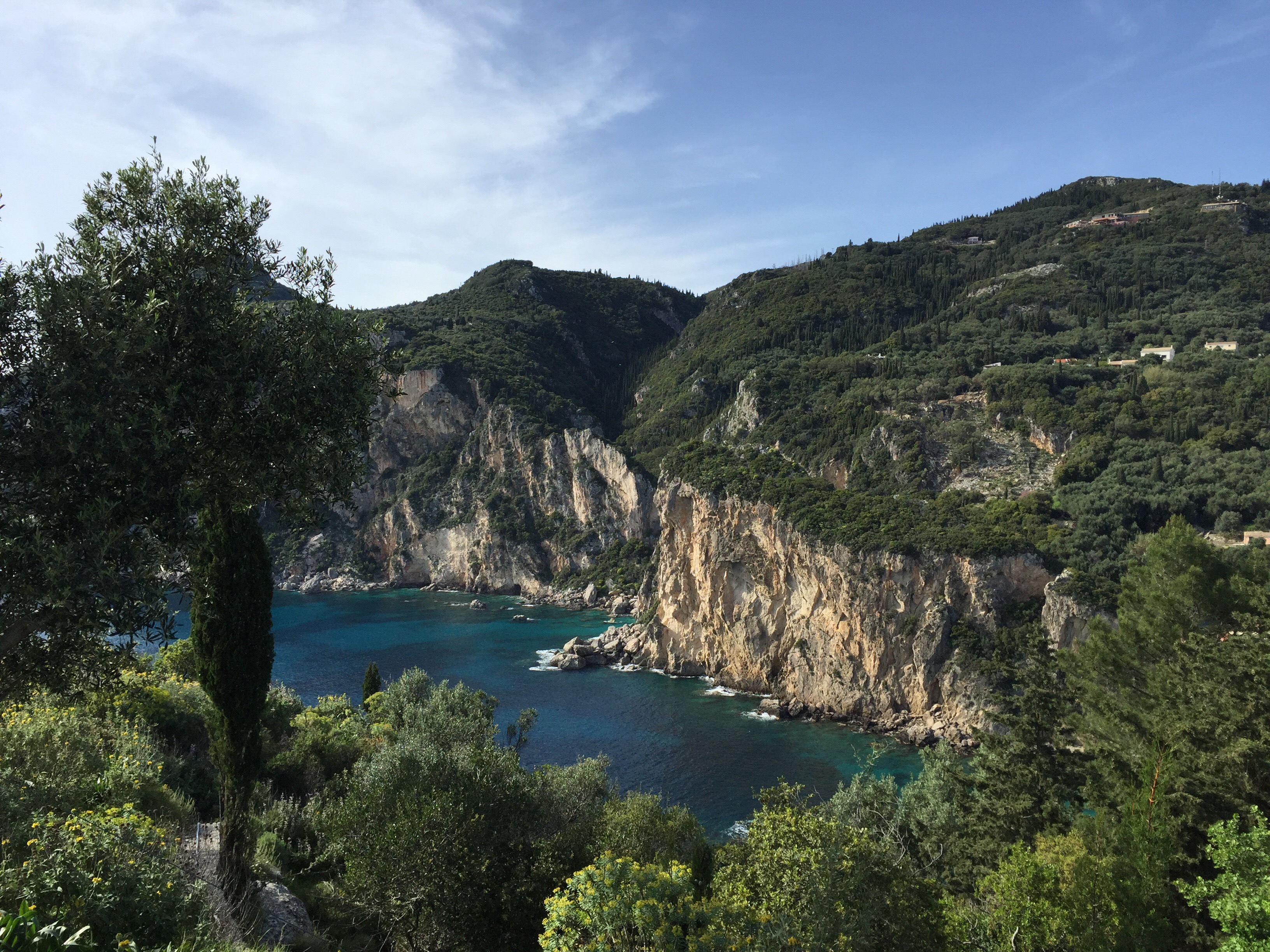 Paleo Kastritsa und das Kloster. Paleo Kastritsa ist als Ort nicht so wirklich interessant. Was da toll ist: Der Ausblick vom Kloster über die Buchten, die türkis zu allen Seiten von den Bergen umgeben schimmern und zum Baden und Tauchen und Schnorcheln und Bootfahren einladen. Und die Buchten selber, zum eben Baden und Tauchen und Schnorcheln und Bootfahren. Sehr schön ist auch Angelokastro bzw. die Klosterruine da und wenn man von da Richtung Paleokstritsa fährt, kann man in Lakones auch ruhig mal aussteigen und die Aussicht genießen.