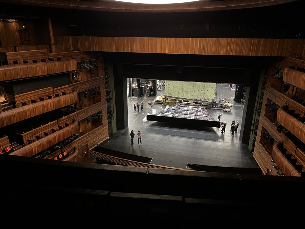 Was mich allerdings sehr beeindruckt hat, war, wie GROẞ all diese Bereiche hinter der Bühne sind. Also nicht nur literally direkt hinter und rechts und links neben der (Haupt-)Bühne, wo nochmal je ein Raum in der Größe eben jener Hauptbühne (16×16 Meter) ist und wo man mit der Bühne wie mit diesen Schiebebildern aus meiner Kindheit Tetris spielen kann. Da kann man die ganze Bühne versenken, verschieben, von rechts eine andere Bühne rein schieben, von oben was runter lassen, you name it. Wir wurden zufällig Zeugen, wie die Bühne oben auf dem Bild nach hinten verschoben wurde: da senkt sich erst hinten der Boden ab, dann fährt die ganze Bühne (ohne dieses Dreieck, das ist nämlich aufgehängt) nach hinten, und zum Schluss fährt vorne der Boden wieder hoch. Aus irgendwelchen Gründen konnte ich mir den Prozess kaum angucken, weil ich irgendwie sowas wie Ekel dabei empfand, sehr seltsam. Aber auch der Rest „hinter der Bühne“ ist irre groß. Eine Etage für das Orchester, eine Etage für die Tänzer*innen und die Werkstätten, eine halbe Etage mit den Garderoben der Schauspieler*innen, eine Etage mit Ballettsälen und Probenräumen. Da arbeiten grob überschlagen 300 Leute. Das war wirklich faszinierend und irgendwie logisch, aber in dem Ausmaß doch wirklich beeindruckend.