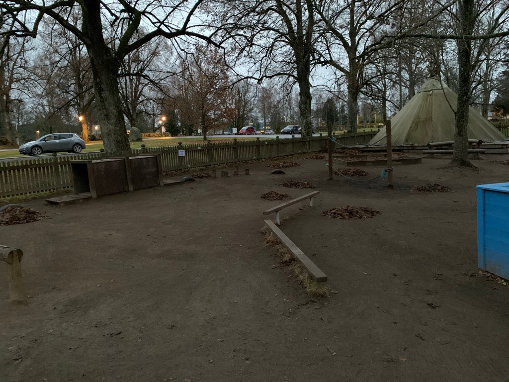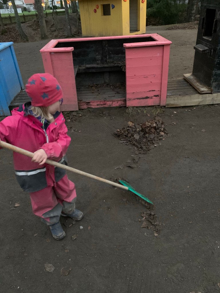 Am Nachmittag war hark-Dugnad [Gemeinschaftsarbeit] im Kindergarten. Unser Kindergarten hat grad wegen Krankheit echte Personalprobleme und da harken die nicht auch noch nebenher. Verständlich. Aber es stehen riesige, alte Linden überall auf dem Gelände und das ganze Laub kann da nicht bleiben. Also harkte ich und fuhr auch noch einige Schubkarren voll Laub weg, dann wurde es aber zu dunkel. Pippi hat natürlich sehr kräftig mitgeholfen und war sehr stolz, dass Mama auch Dugnad macht. Integrierter geht kaum.