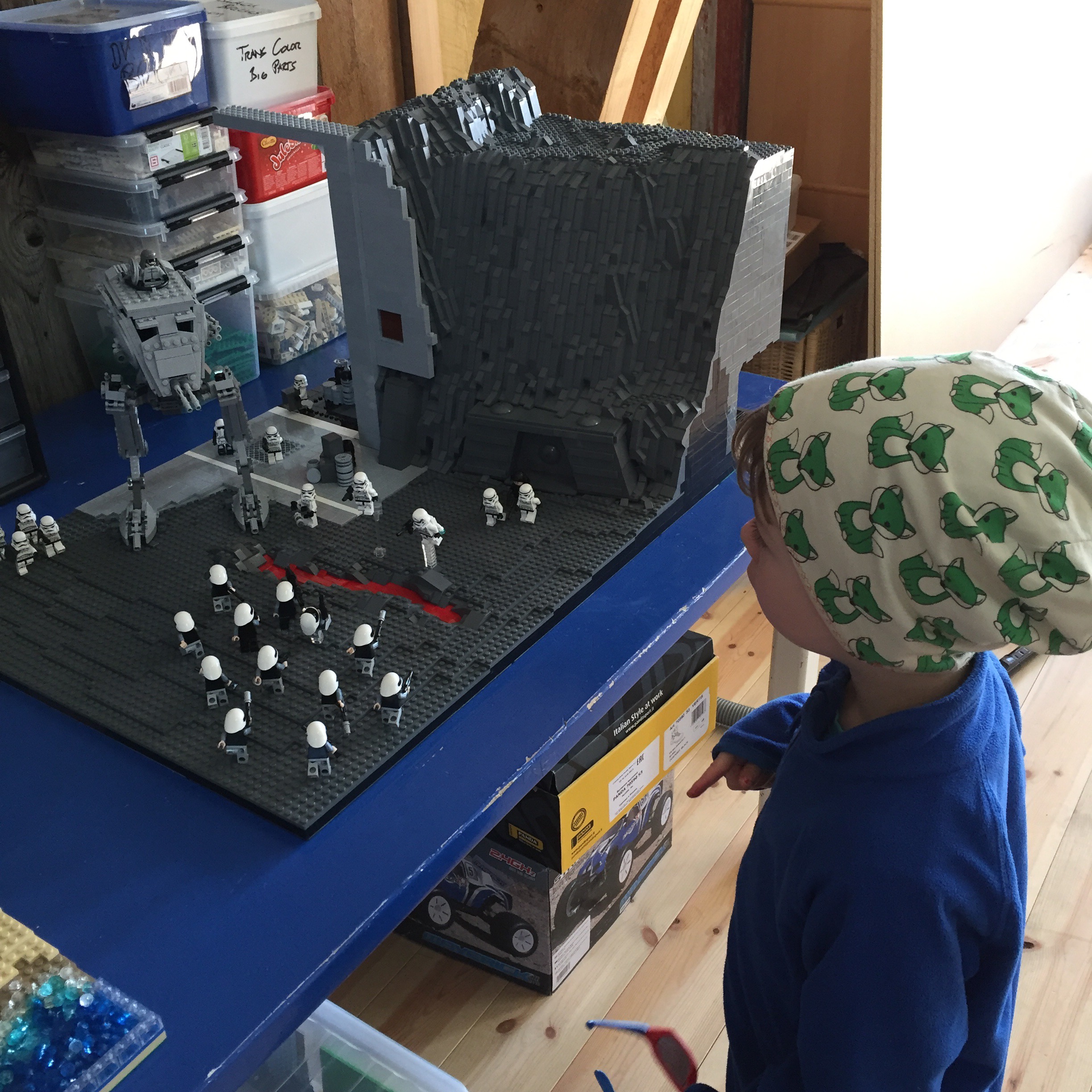 Auch sehr beeindruckend für Michel: des Teenies Reich. Der baut ganz offensichtlich sehr gerne Lego. Es standen sicher 4 bis 6 große (riesige!!!) Lego-Expert-Sets aufgebaut herum, in der Mitte des Raums (der Teenie bewohnt quasi den ganzen „Heuboden“, der aber als Wohnraum ausgebaut ist) steht ein sehr großer Tisch mit dem aktuellen Projekt: dem Simpsons Quick-e-Mart. Aber: alles nicht zum Anfassen gedacht.