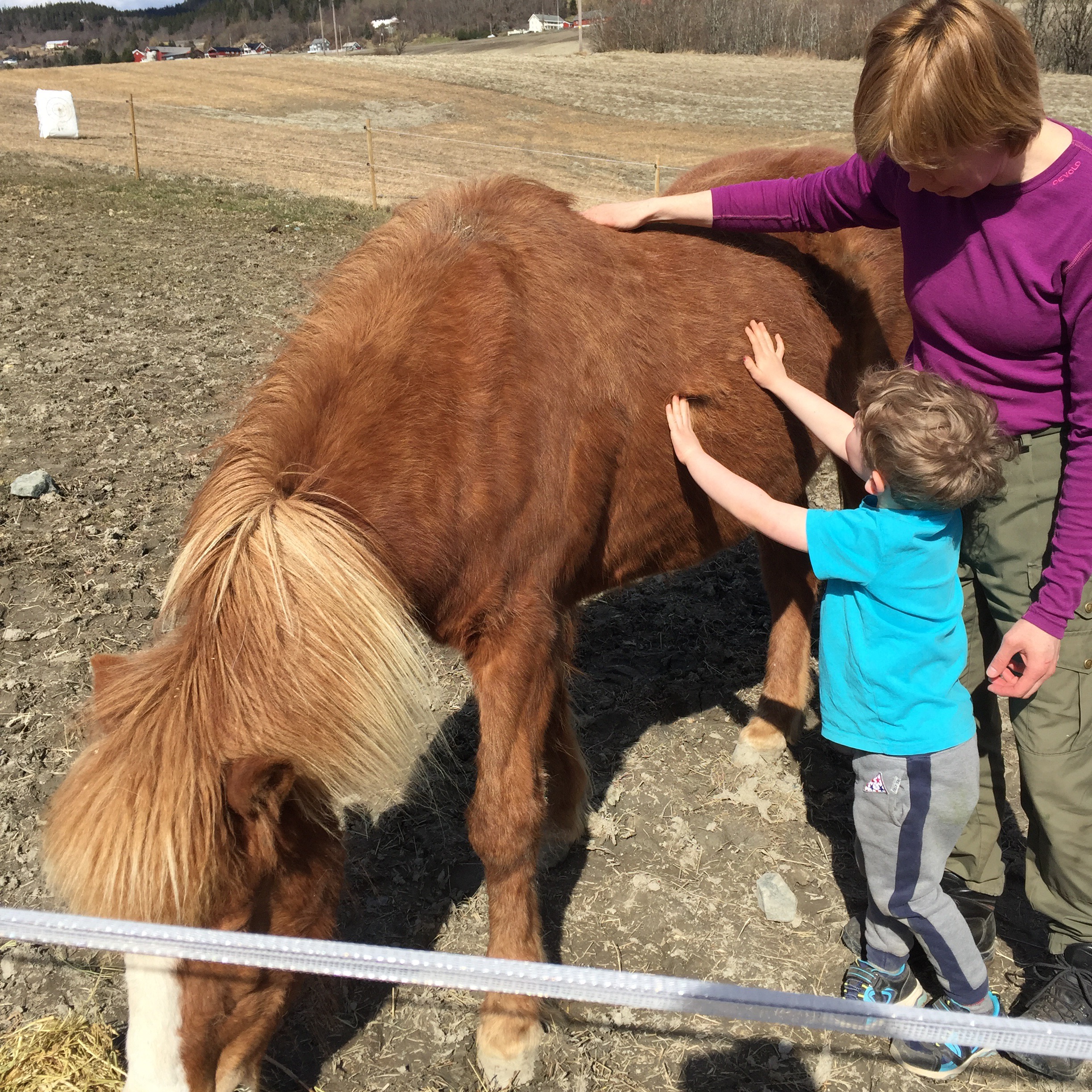Als wir ankamen, staunte ich wirklich nicht schlecht: K. hat nicht nur Pferde, sondern einen richtigen Hof. Freilaufende, äh, Flauschhühner begrüßten uns, Pippi geriet total aus dem Häuschen und rief erst „Gagagei!“ und dann nach Aufklärung „Kikiki!“ und „Pook, pook, poooook!“. Michel freundete sich mit Sara, dem Minischwein an und fütterte es mit Waffeln (das durfte er, wir haben gefragt). K. zeigte alles den Kindern, Michel durfte sogar auf dem einen Pferd sitzen (die Teeniemädchen waren nicht da) und das totale Highlight war, als es aus dem Hühnerhaus plötzlich laut und ausdauernd zu gackern anfing und K. zu Michel sagte „Weißt du, was jetzt passiert ist? Jetzt hat ein Huhn ein Ei gelegt!“ und ihn mitnahm, das Ei zu holen. Michel war unglaublich beeindruckt, es waren sogar zwei Eier und er bekam die Eier geschenkt, weil er so toll mitgeholfen hatte. Stolz wie Oskar trug er seine Trophäe herum und passte wirklich gut drauf auf, dass den Eiern bloß nichts passiert. Pippi lernte ein paar neue Worte, nämlich „jaukeln“ (schaukeln), „Hahn“, „Huhn“, Fääät“ (Pferd) und „hest“ (norwegisch für Pferd), „grisen“ (norwegisch für Das Schwein) und natürlich „Waffen“ (Waffeln). Und das ganze bei strahlendem Sonnenschein und 17 Grad. Ehrlich, es war so schön, dass mir vor lauter Harmonie lauter Schimpfwörter im Kopf herumirrten, als Kompensation sozusagen. „Scheiß die Wand an, ist das schön hier.“ Vielleicht war ich zu lange in Westfalen.