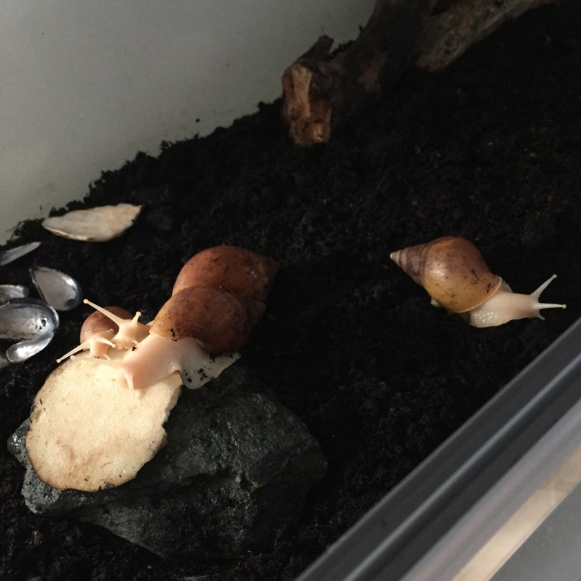 Auch mehr delightful: neues Schneckenbild, weil heute sauber gemacht. Wir haben jetzt (aus Gründen) zwei große (ich nehme an, ausgewachsene) und zwei kleinere Schnecken. Eier gelegt haben sie immer noch nicht, nicht, dass ich darauf scharf wäre, aber ich mache mir etwas Gedanken, ob was nicht stimmt, oder ihnen was essenzielles fehlt.