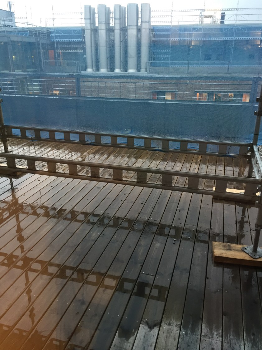2 Stunden vor der Party goss es in Strömen auf das auf der Dachterasse wegen Dachdeckerarbeiten installierte Baugerüst.
